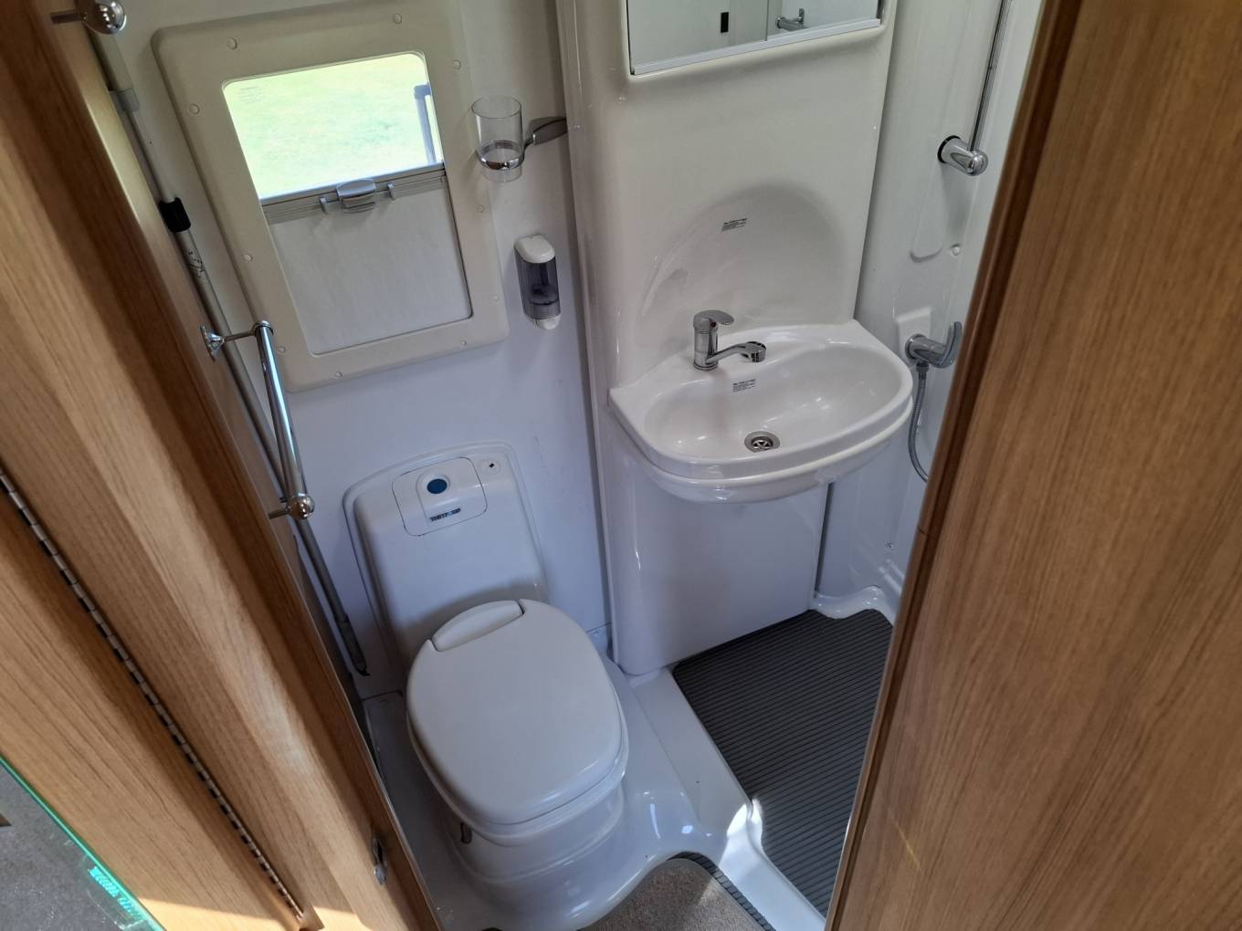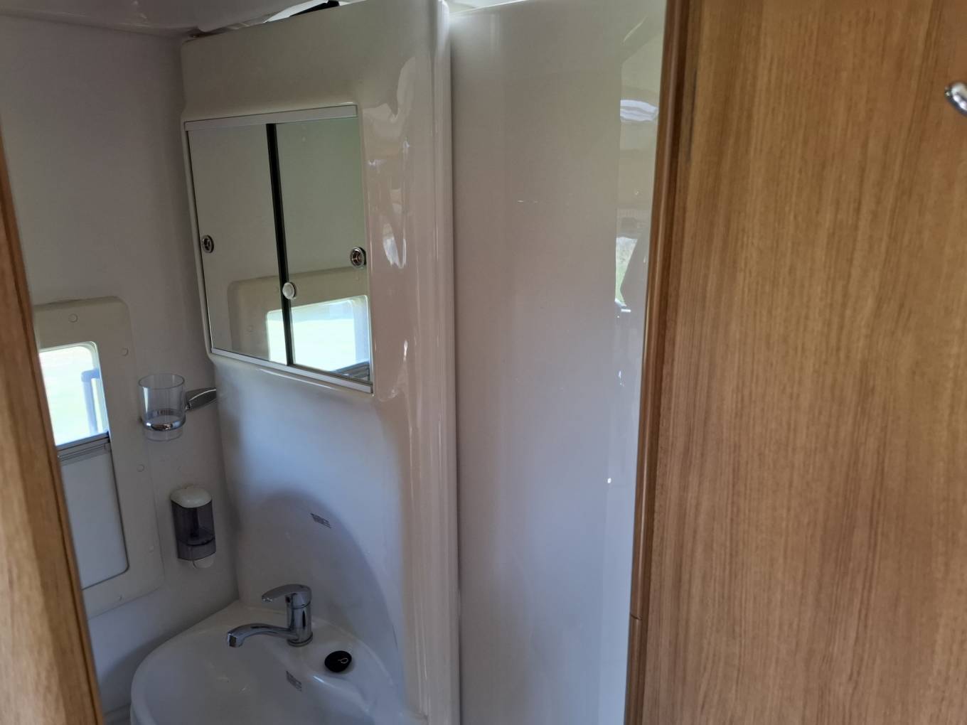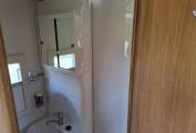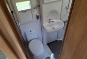 Opposite the fridge is a wardrobe above the heater, which is located next to the offside rear washroom, which contains a toilet, a sink, and a shower.