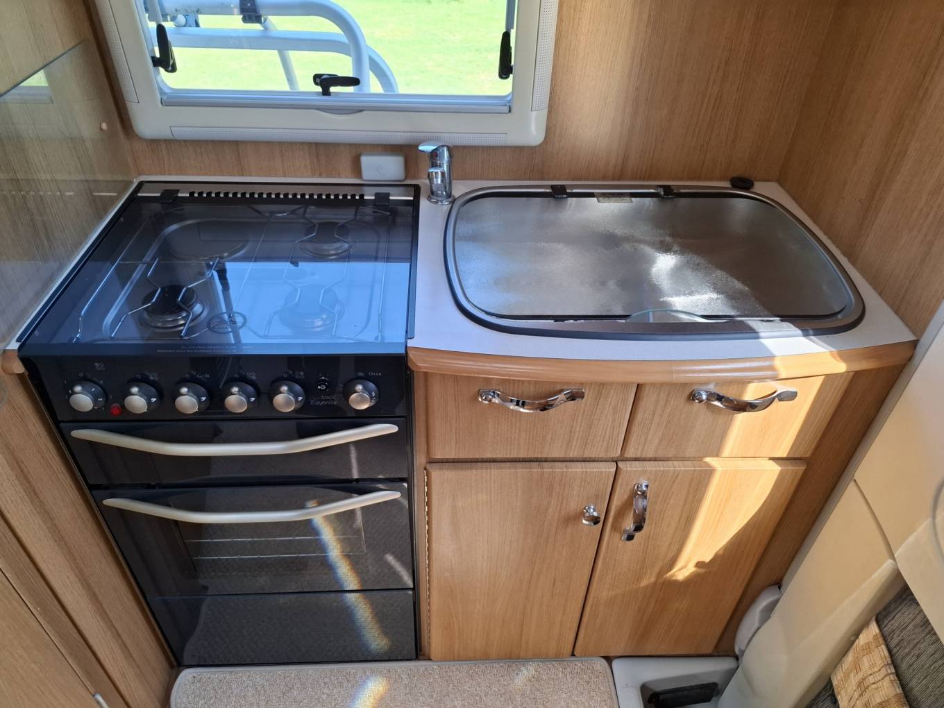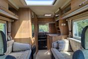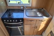 At the rear of the vehicle is the kitchen which has a full oven, a grill, a hob with 3 gas burners and an electric plate, and a sink with an integrated drainer. There is an adjacent work surface/TV shelf, below which is a fridge with a freezer box.