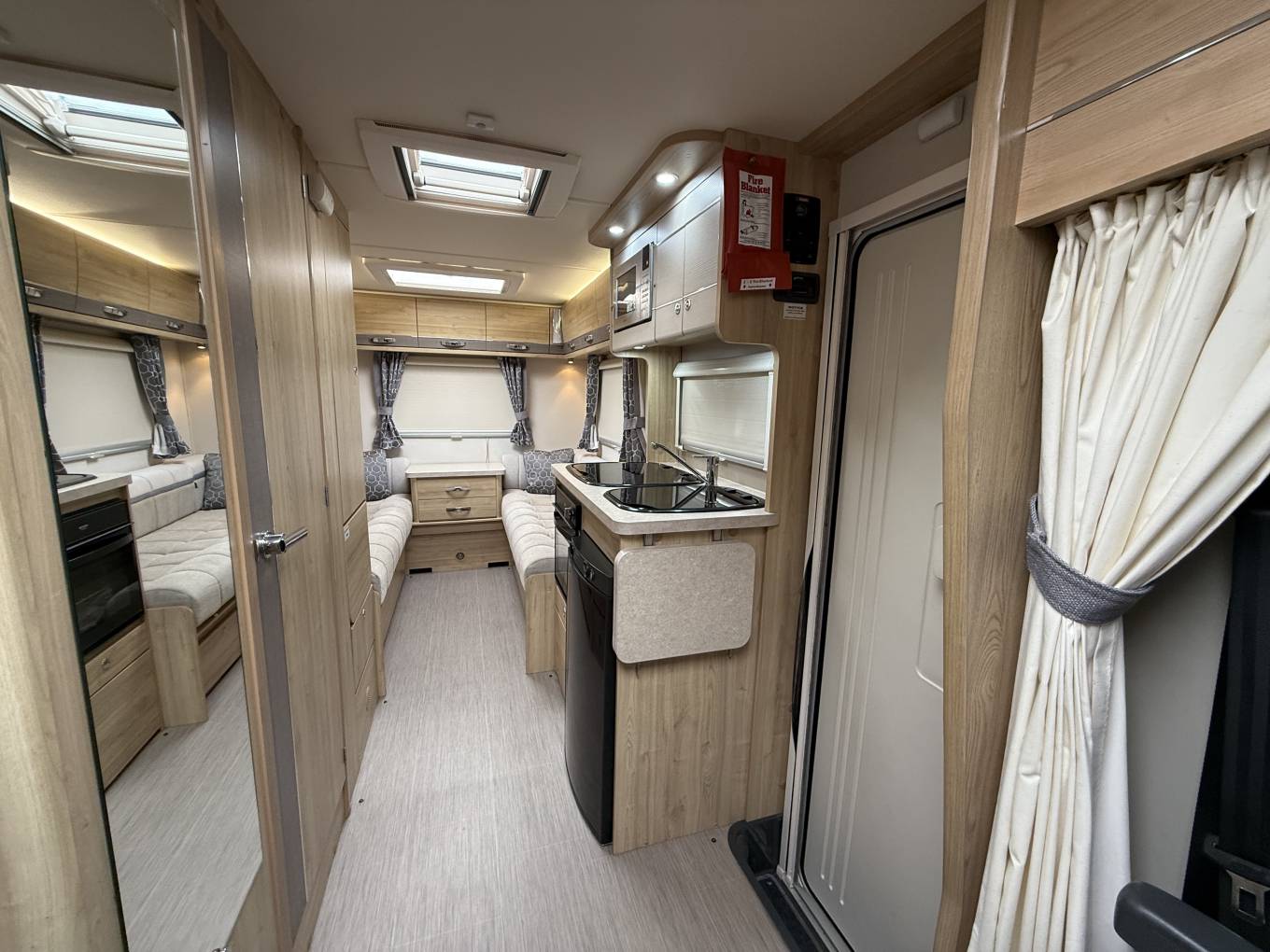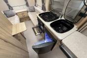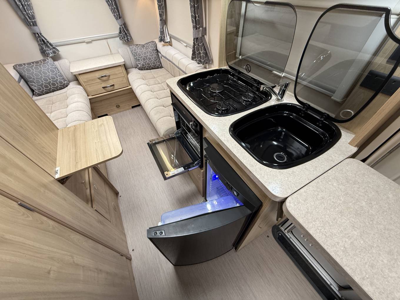 Here you will find a Three Gas Burner Hob, an Oven and Grill combination, a Three Energy Source Dometic Fridge, a Microwave Oven, a Sink with a Hot and Cold Mixer Tap and a removable Drainer, worktop space with two fold out extensions plus plenty of cupboard space.