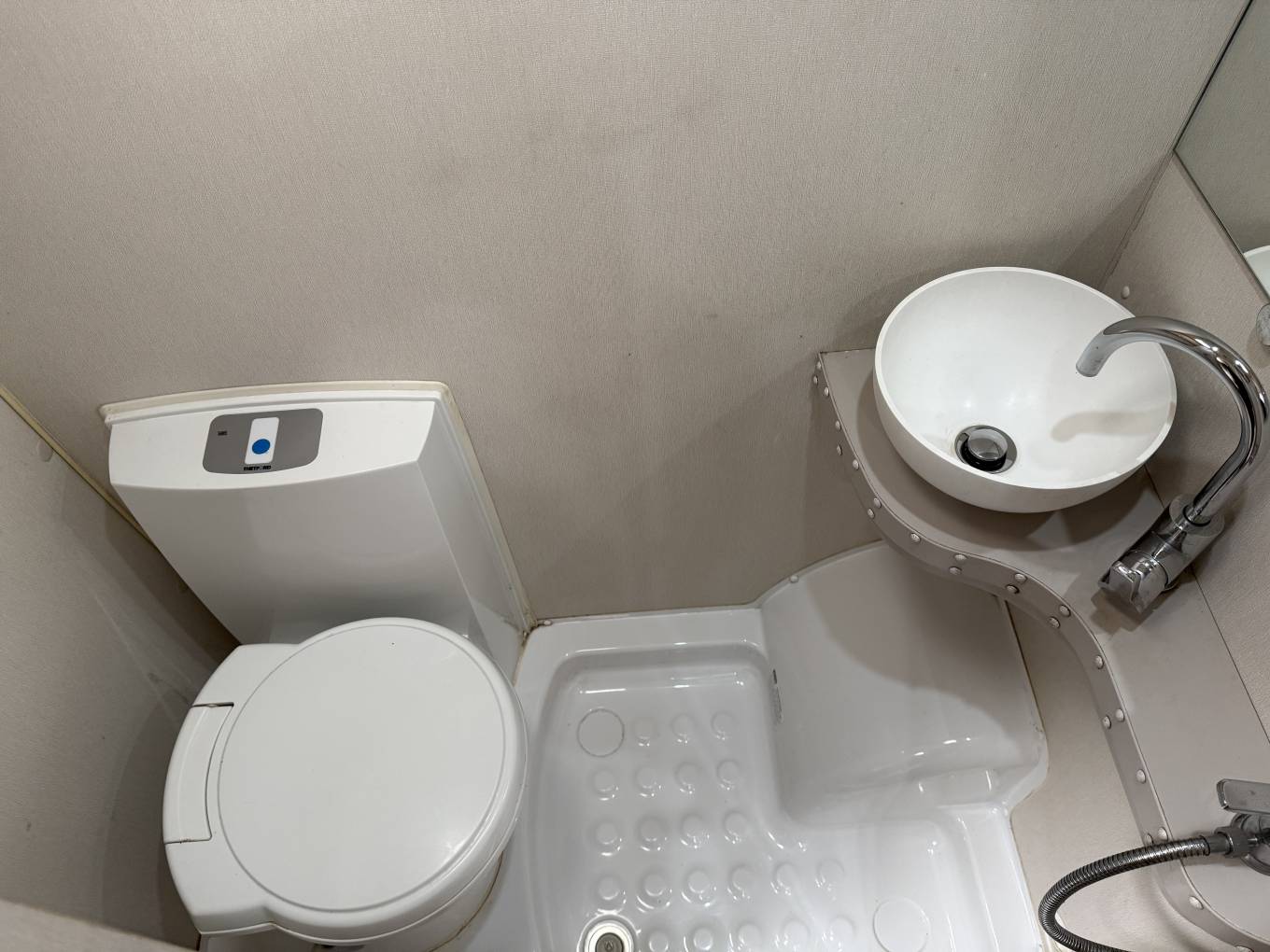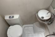 Opposite the kitchen is the Bathroom consisting of a Thetford Flushing Cassette Toilet, a Wash Handbasin and a Shower Unit.