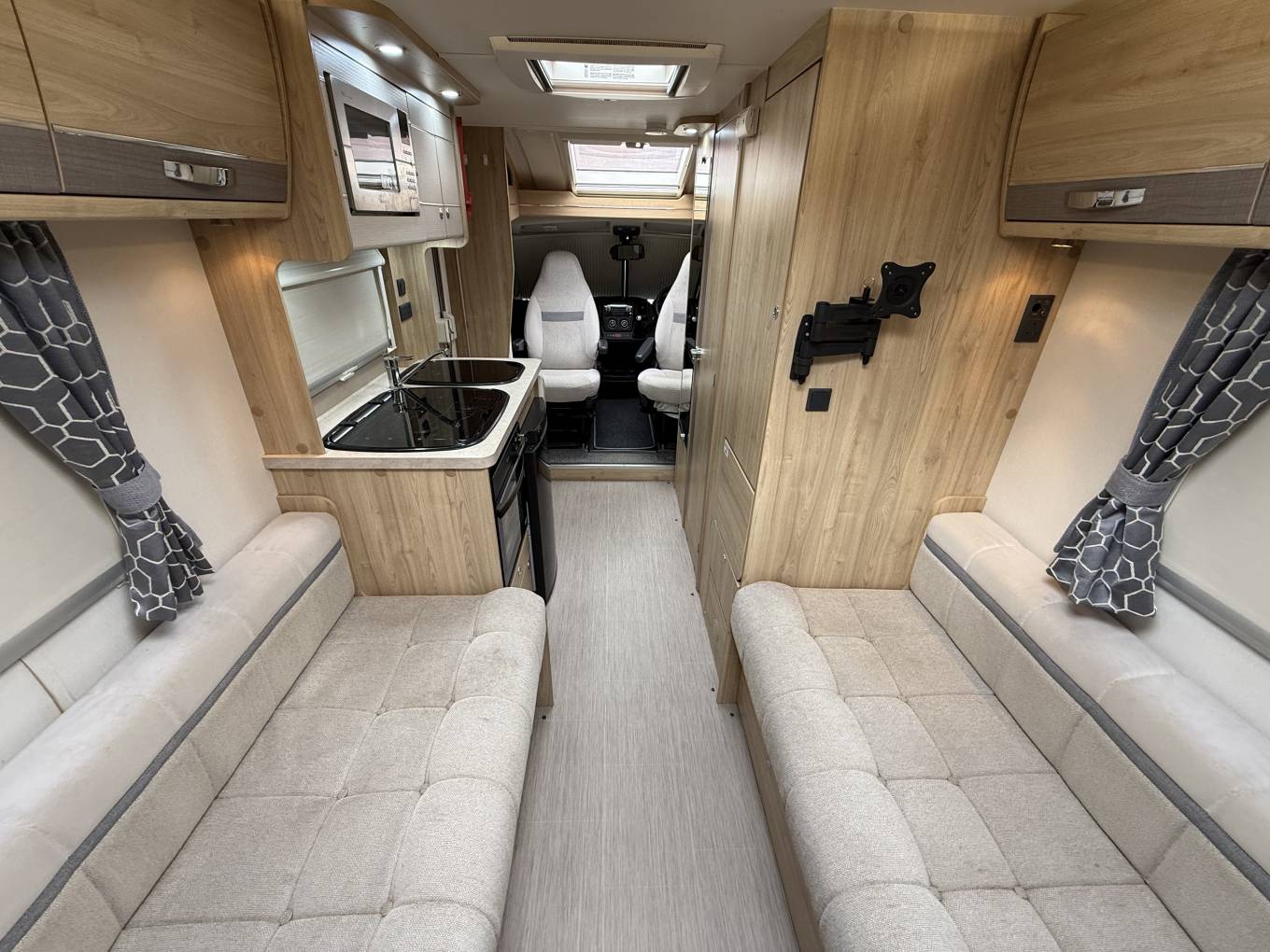 On entering via the flyscreen protected habitation door to your left are the twin swivelling Cab Captains Chairs and to the right the fully equipped kitchen.