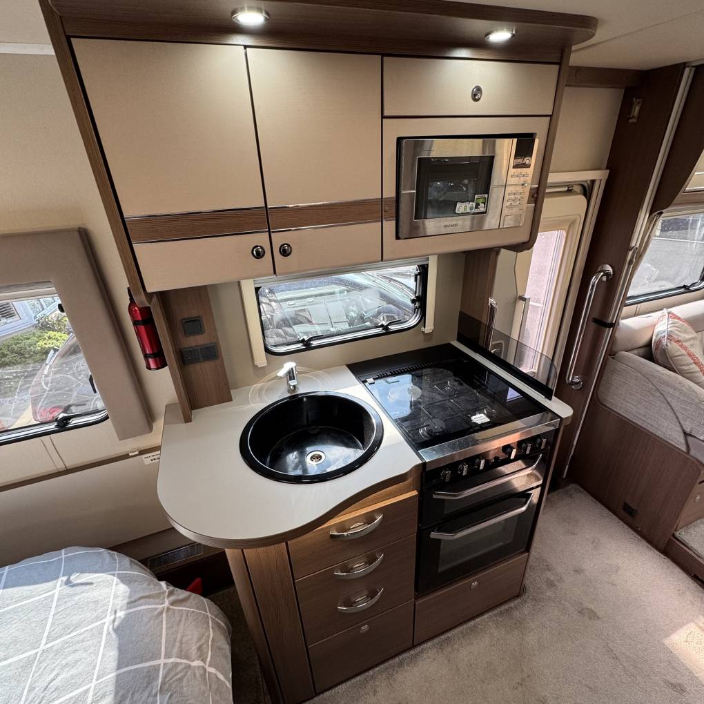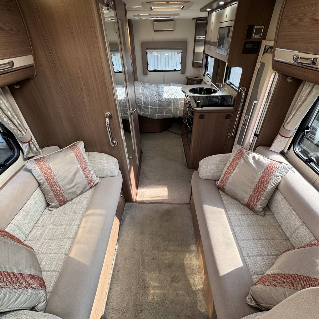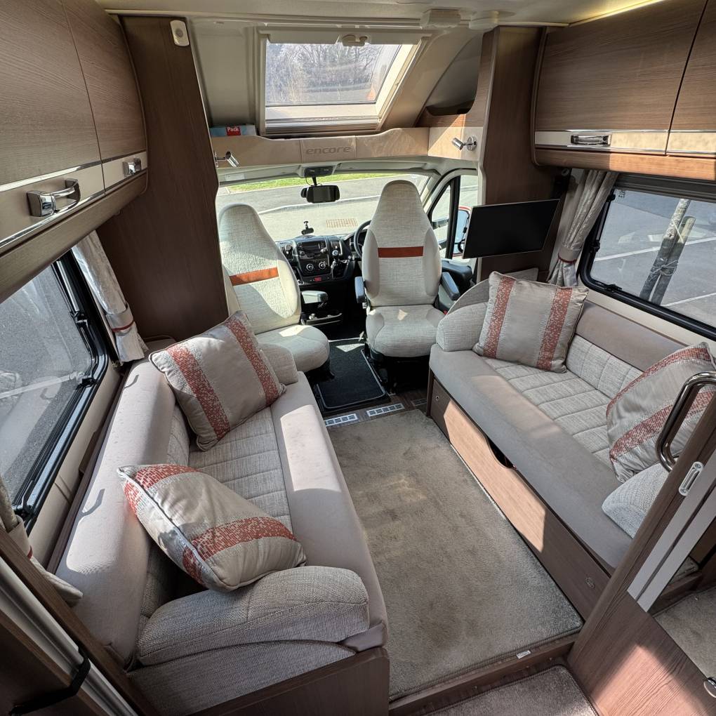 A best-selling open plan coach-built motorhome for four. The front lounge converts into a double bed. The side kitchen comes equipped with everything you need for a touring holiday, whilst the centre washroom - with its shower cubicle - and spacious rear island bed proves that with the luxurious Encore there really are no compromises!