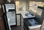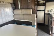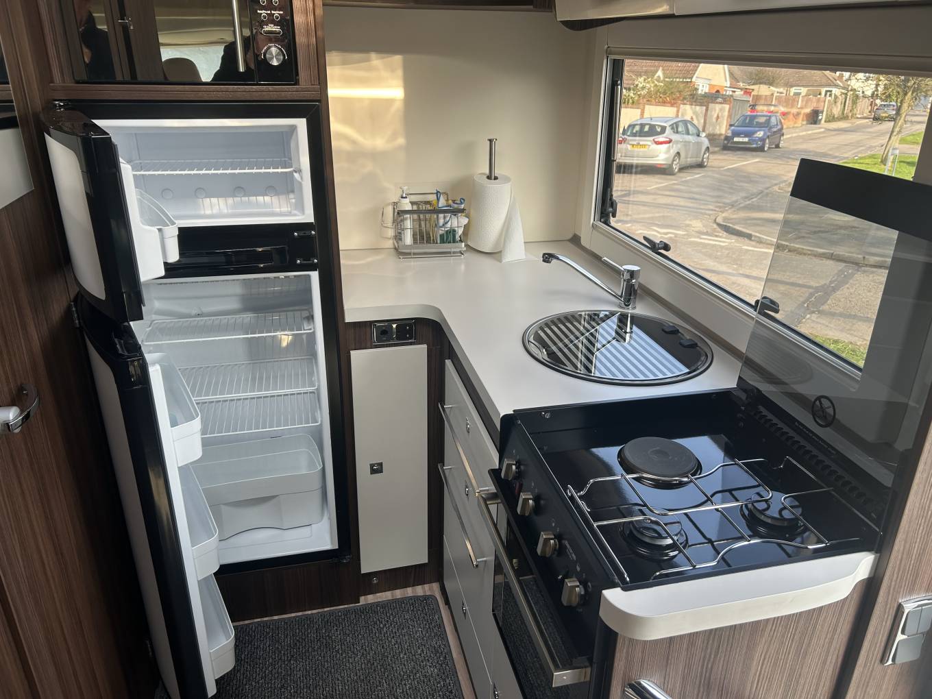 As mentioned the internal layout of the motorhome is excellent and really does make the most out of the space available. At the front of the motorhome you have a large lounge which makes use of the two captains chairs and has an L-shaped sofa and a further single sofa. It also has a large multi-directional table that can be raised and lower electronically. This area is absolutely ideal as a place to relax or enjoy a meal or snack. There is a large sunroof with also lets the natural light flood in. Moving to the back of the motorhome you have an extremely well equipped kitchen will lots of preparation space. It comes with oven, grill, duel fuel hob with 2 gas burners, microwave, sink with mixer tap and large 3-way fridge with separate freezer.