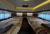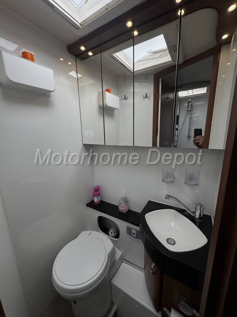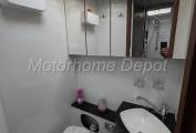 Moving rear again is the bathroom area which is split across the motorhome for maximum convenience. The toilet door can close the aisle making a private area to get dressed in the morning. The separate shower cubicle on the passenger side has Perspex doors to close, a mixer tap and chrome riser for the shower head. Opposite is the washroom which is light & bright with the use of mirrored cupboards there is a cassette style Thetford electric fresh water flush toilet & above a white oblong built in sink with chrome mixer tap.