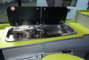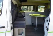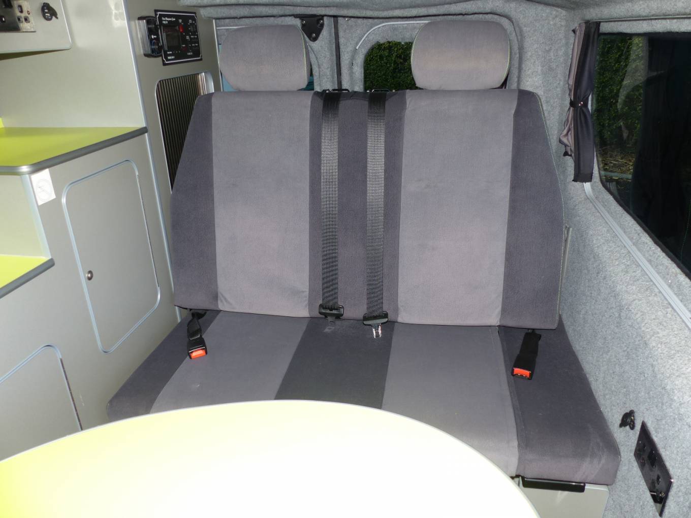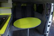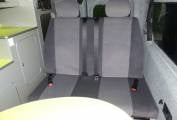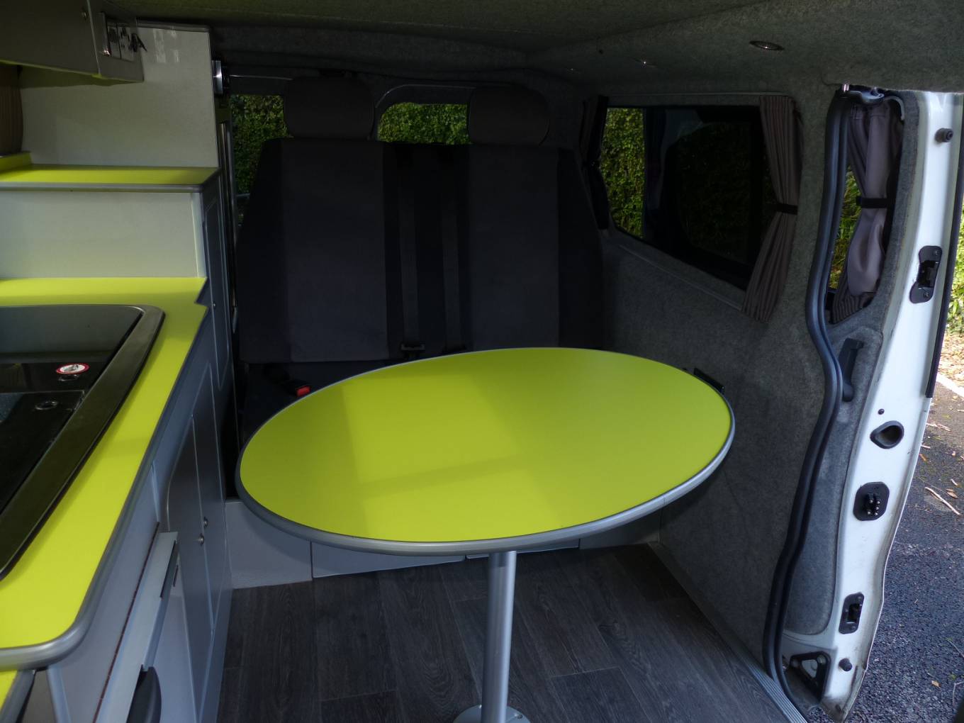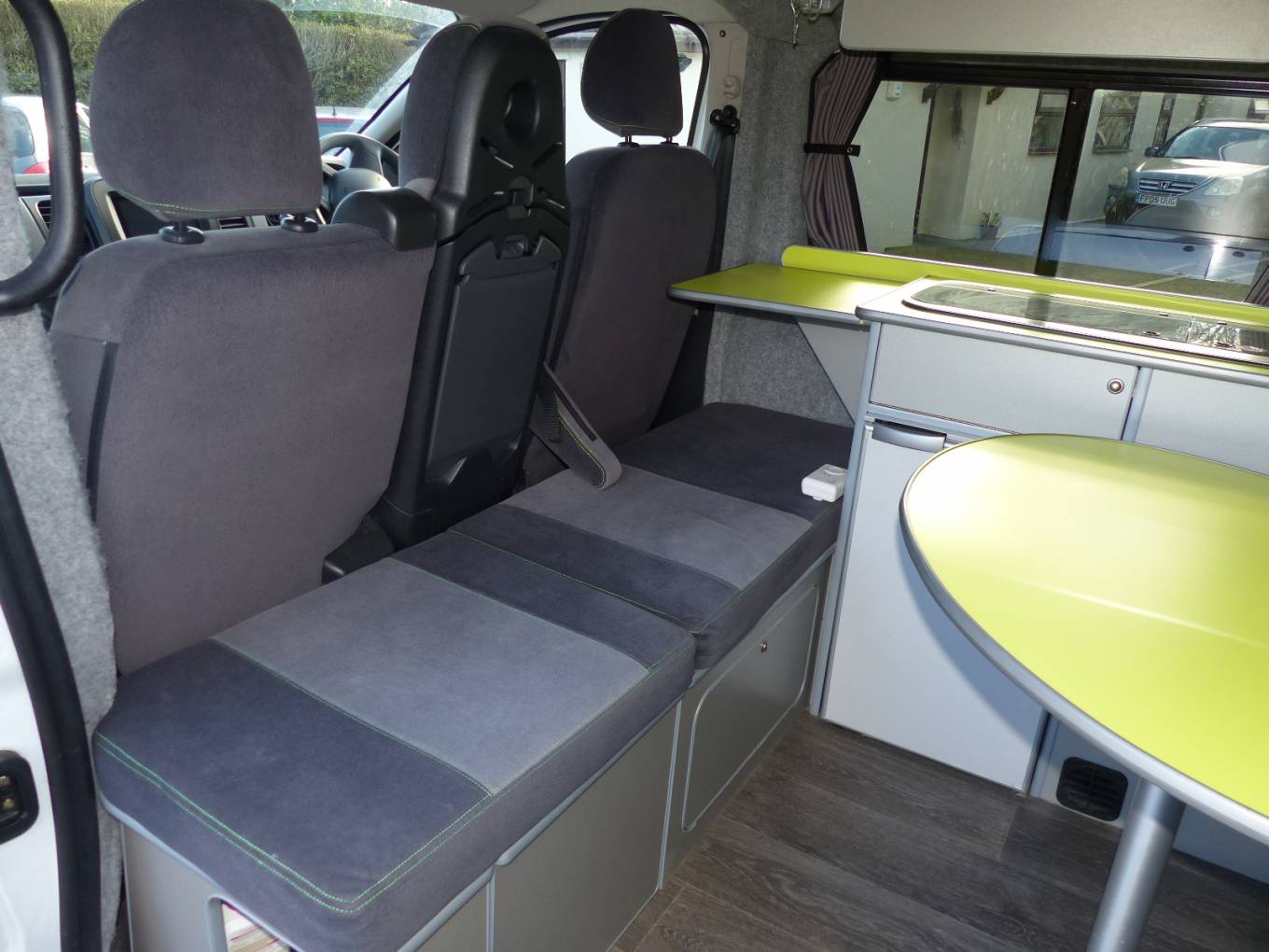 Sussex campers have completed this fit out in a bright modern style and with all the facilities needed for those long awaited holidays. There are 4 travelling seats belts and the rear seats convert to a good sized double bed. Above in the pop top, there is space for 2 children and during the day this area can be used for storage if need be.