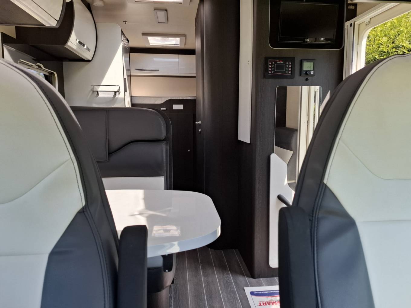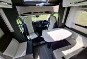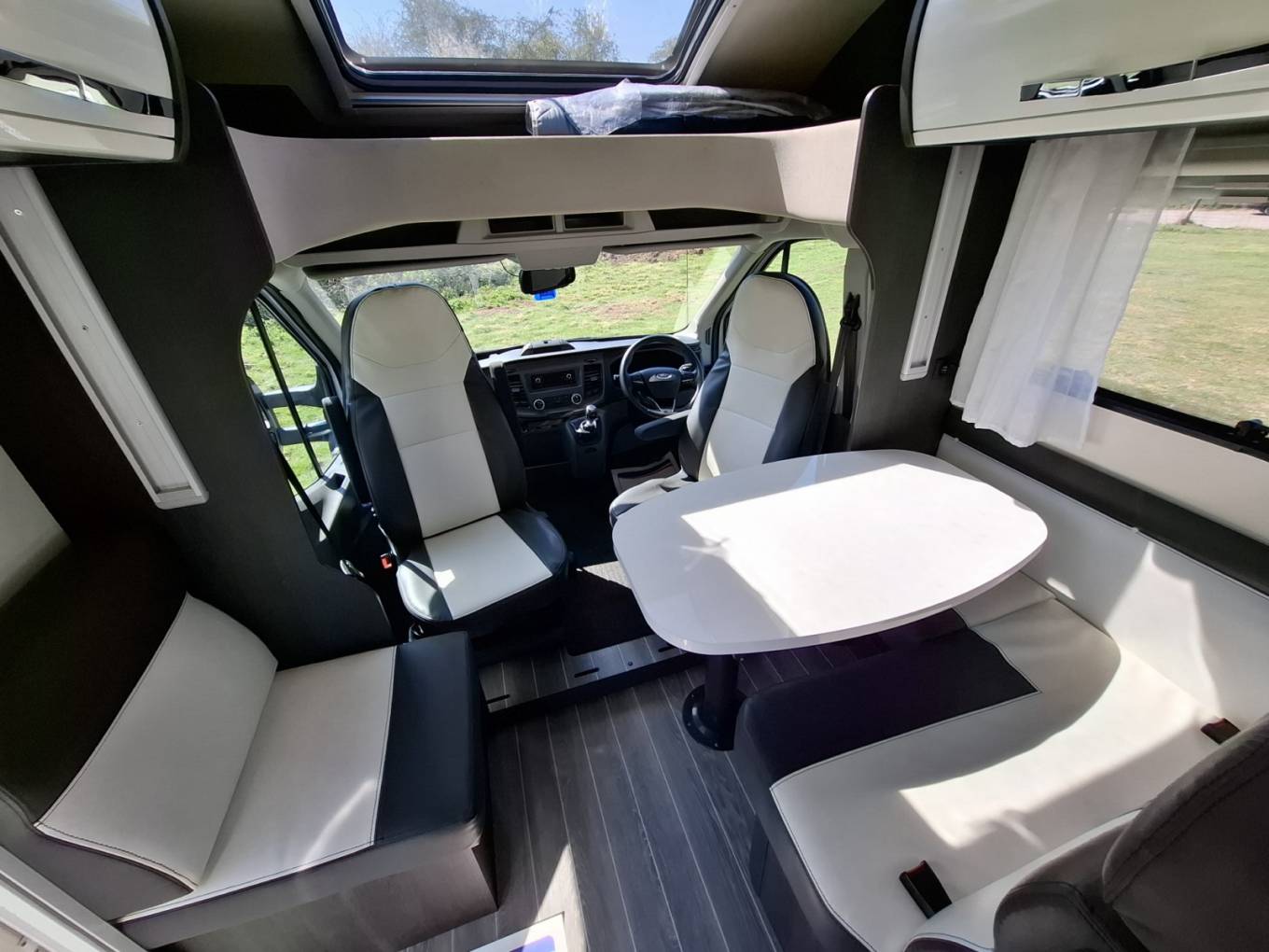 Behind the driver’s cab position is a dining and leisure area with a L-shaped seating (with two additional forward facing seat belts) and an adjustable table, plus an additional side seat behind the passenger cab seat, that is well lit by the surrounding windows and over cab skylight.