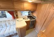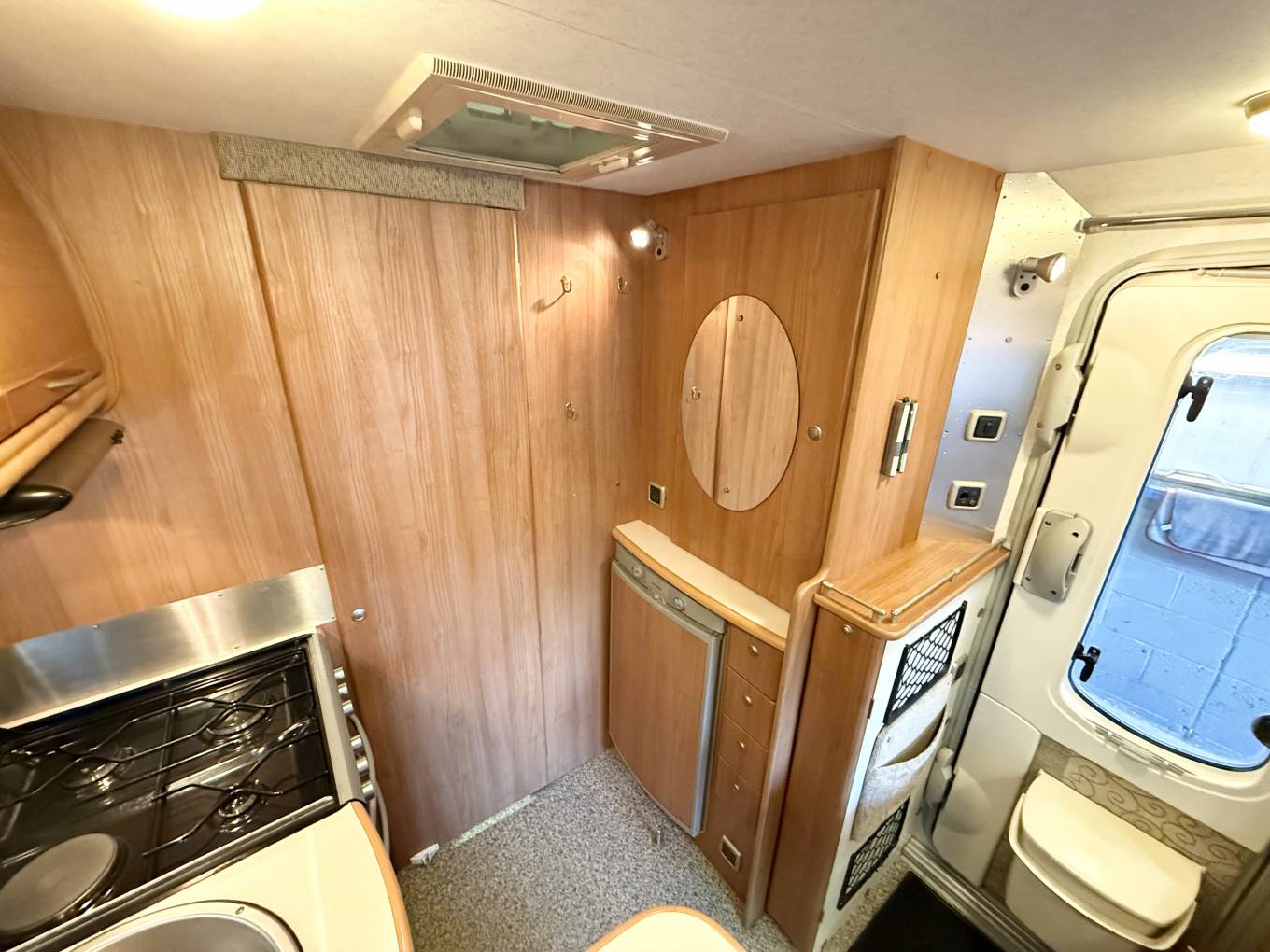 All fabric including all seats and cushions are in good condition. On Entrance to the motorhome is via the door towards the rear is The kitchen area has a gas hob, gas oven and grill, sink and drainer area, a unit which pulls out to increase the preparation area with units below and a fridge/freezer. Above the fridge is a large wardrobe with hanging rail.