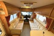 The lounge area has two very large side facing benches which quickly convert to a large double bed. With a foldable table and the front two seats turning around to the table there is easily room for around 6 people and with the large rooflights and windows throughout the motorhome there is a light and airy feel. There are lots of head height lockers throughout.
