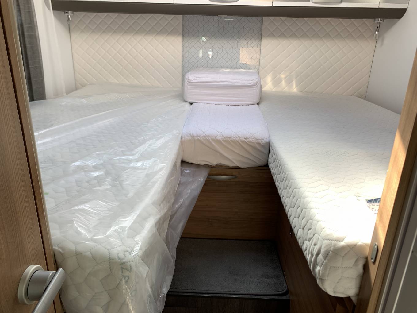 Layout features a rear fixed bed, configured as 2 singles or a double over a large duel access garage, split washroom with full shower on one side, toilet and wash basin on the other.
