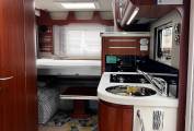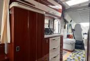 There are two huge transverse drop-down beds, both with mattresses over sprung wooden slats, and privacy curtains. The rear bed is 1.90m x 1.42m, electrically lowered, and accessed by a low ladder. It has handy wall cubbies all round. The front bed (1.87m x 1.37m), pulls down manually (very easily), once the cab seat-backs have been inclined forwards, and is slightly higher.