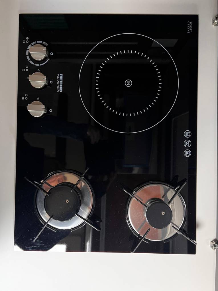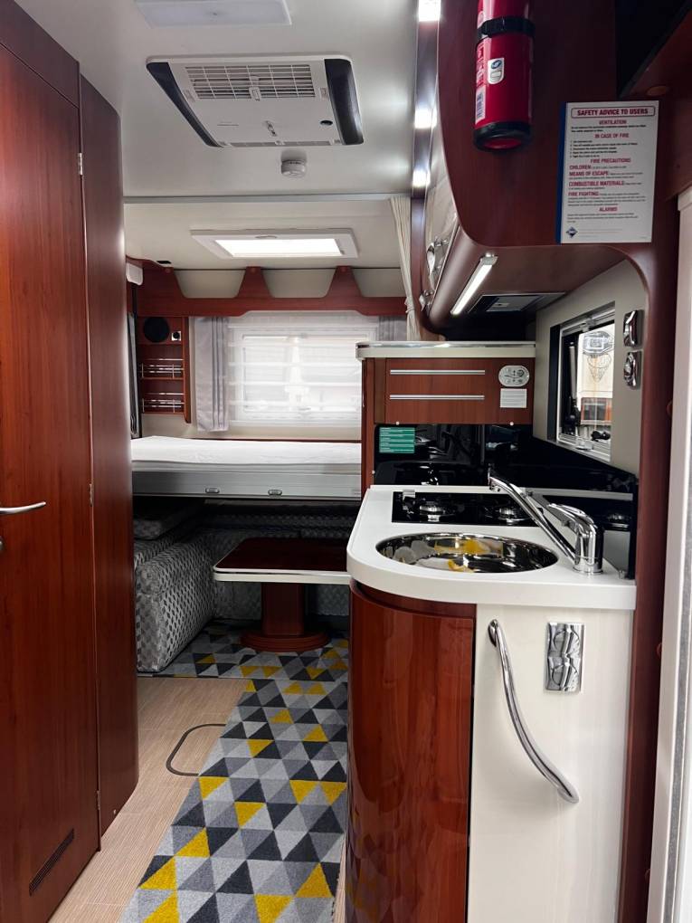 The central kitchen has masses of storage, a huge sink, a three-burner hob with overhead extractor, an oven/grill and 150-litre Thetford AES fridge and freezer, situated opposite. A nifty feature is the dedicated travelling storage for the sink’s chopping board lid – a slide-out unit in the top drawer, which can provide extra work surface. The cupboard over the wardrobe, alongside the kitchen, contains a third TV point.