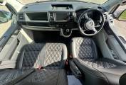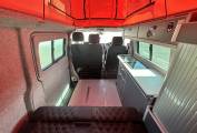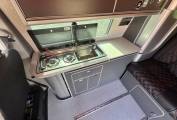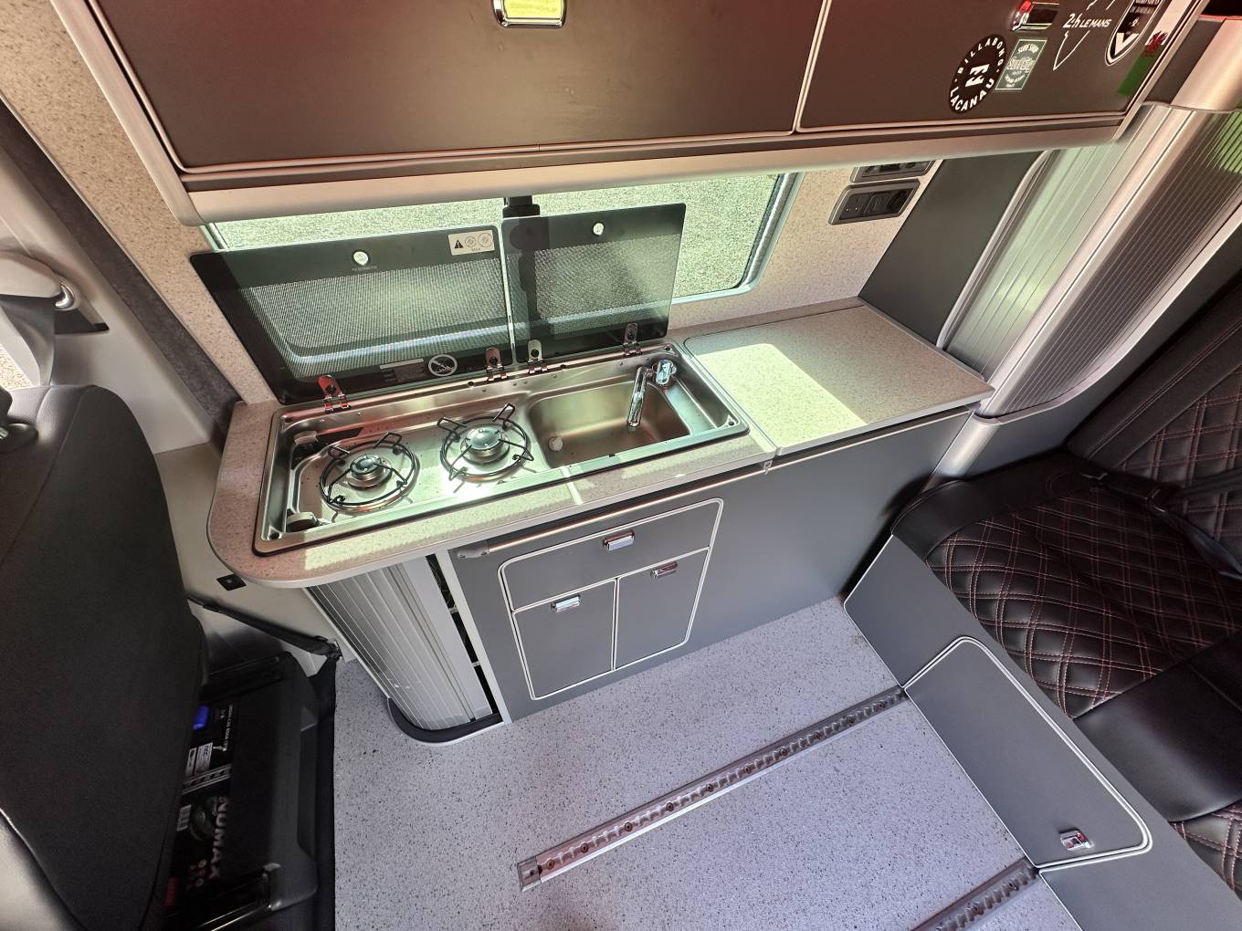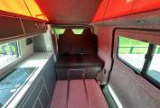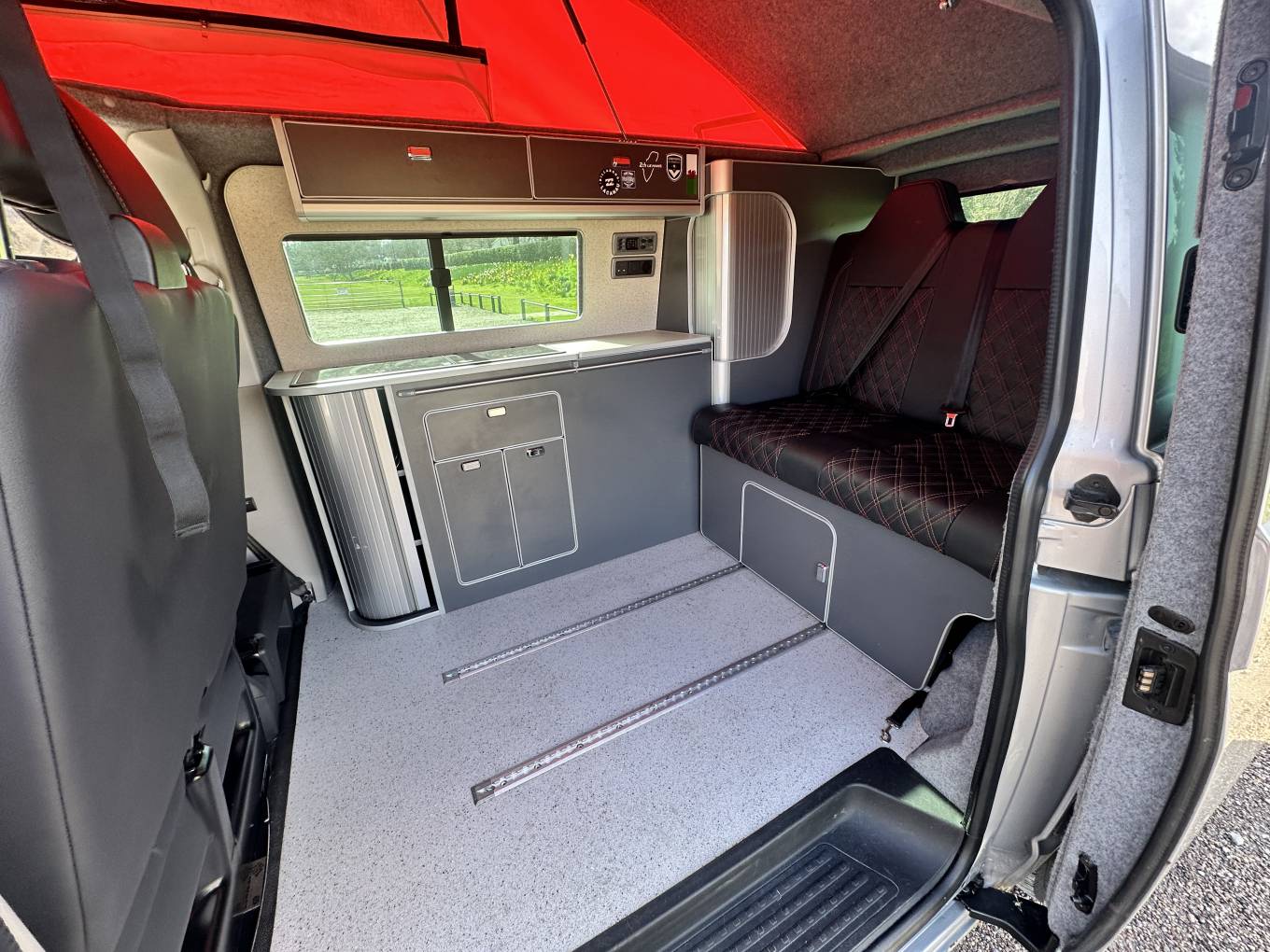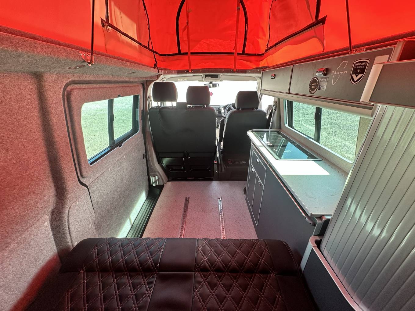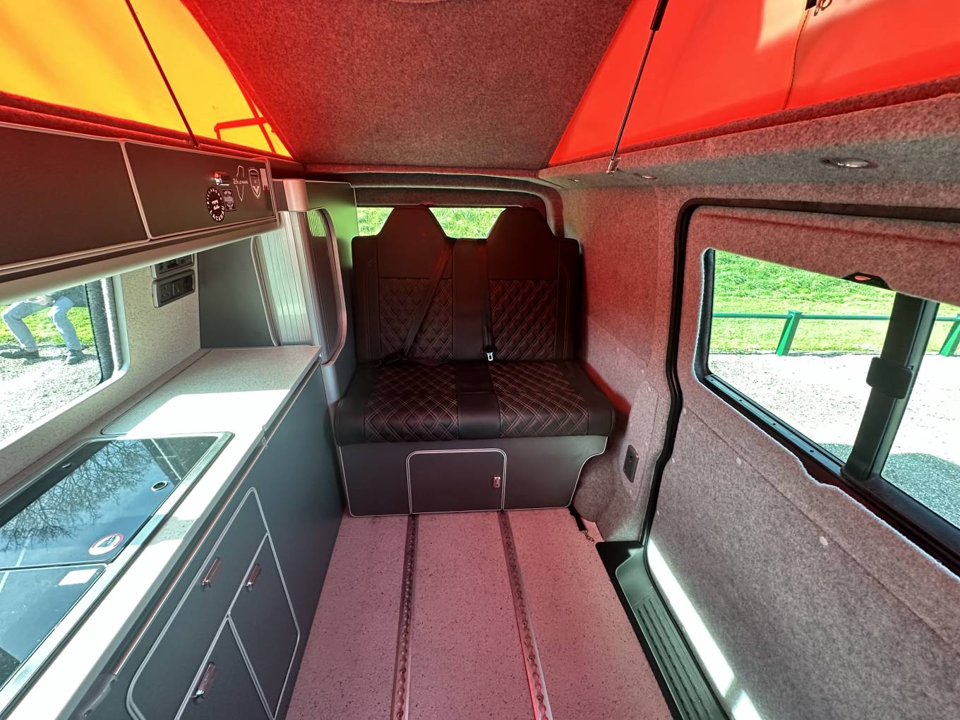 Starting at the front of this campervan you have the double passenger captain seat which swivels to the rear giving you a great area for relaxing & socialising, with space around a central table that is easily removed and stored. The central dinette has a quality kitchen area with Smev 9222 double hob, sink, pump, and bottle, webasto top loading fridge and plenty of storage space. As evening nears the rear travelling seats easily convert into a comfortable double rock “n” roll bed with storage underneath. You will find the second sleeping area in the skyline pop top which has 3 large windows giving plenty of natural light. When this is not being used it pushes up to maximise space.