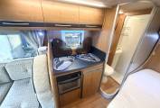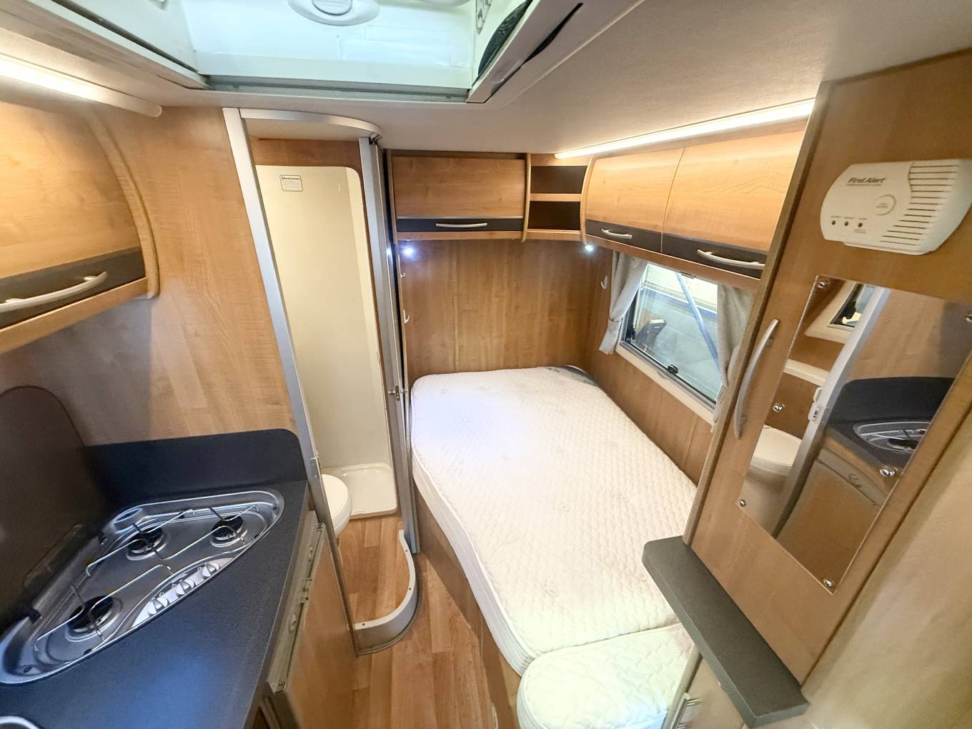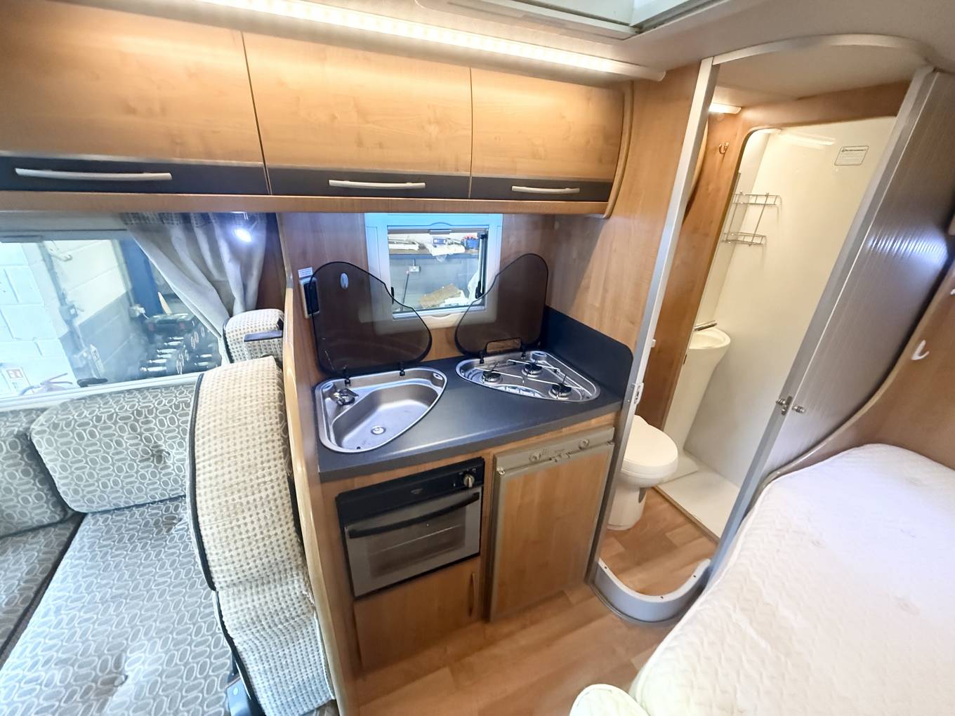 The 2 bench seats act as a front lounge/dining area by day and can comfortably seat 4 people, with the driver and passenger seats swiveling to complete the dining area. A mounted TV affords some extra luxury. By night the bench seats convert to a small double bed. The kitchen is located between the lounge/dining area and rear bedroom. This consists of a 3 burner hob, grill, oven, sink, microwave and fridge with freezer compartment, as well as storage cupboards and drawers.
