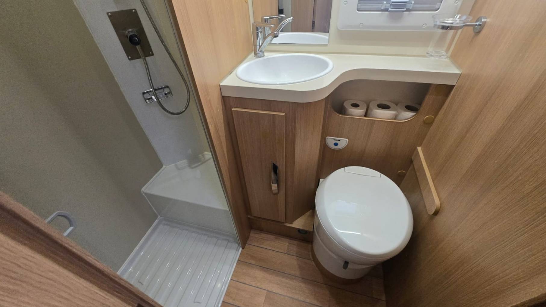motorhome, the modern washroom has a separate shower and toilet area. In the