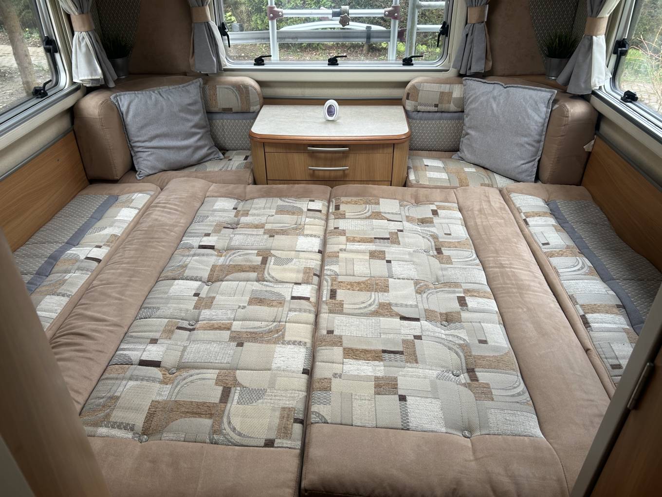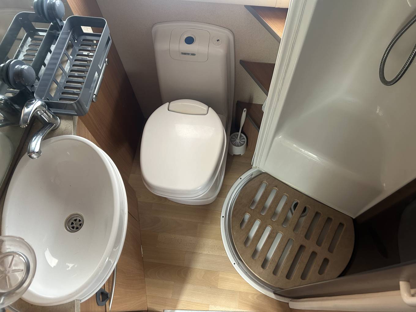 The motorhome is excellent for sleeping in, along with the beds at the rear you also have a very large over the cab bed. A new mattress has been order for this and will still be in its wrapper for any new buyer. There is a further single/small double that can be made out of the L-shaped sofa at the front. At the centre of the motorhome there is a good sized washroom that has a cassette toilet, sink and shower and can be accessed from both areas of the motorhome. Heating and Hot water is provided by the Truma boiler system.