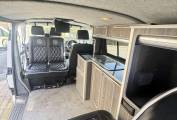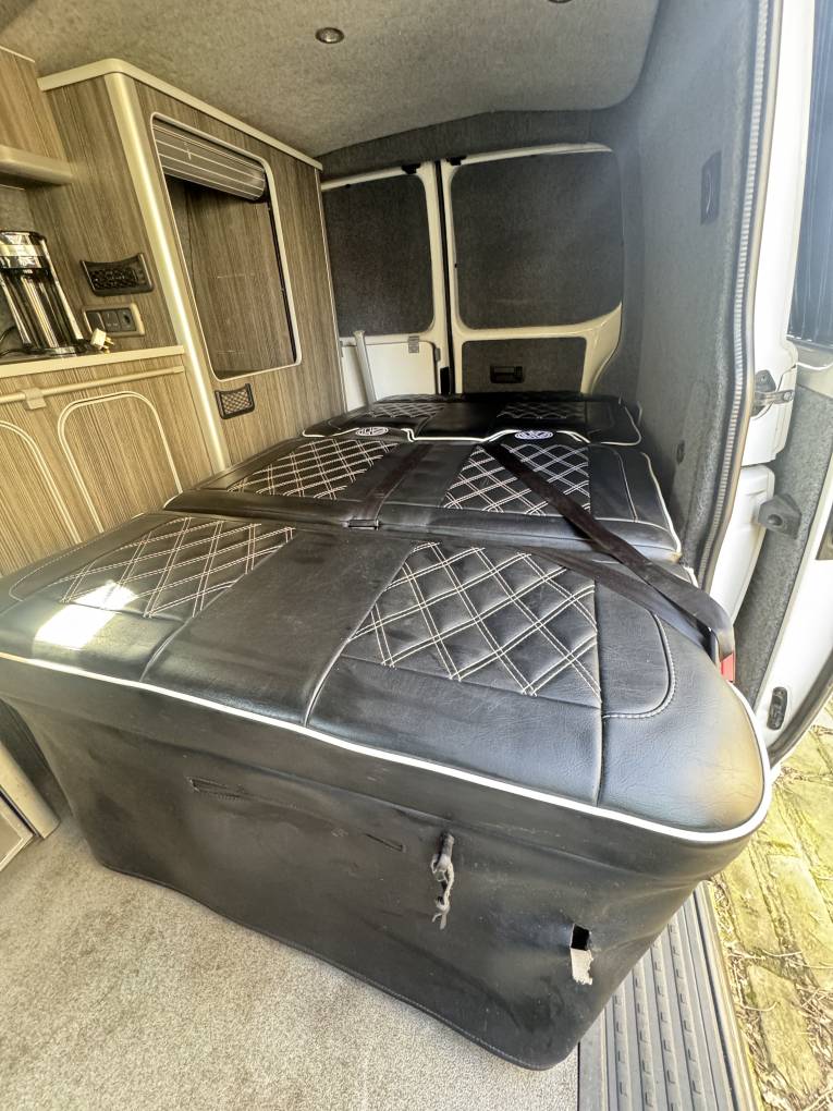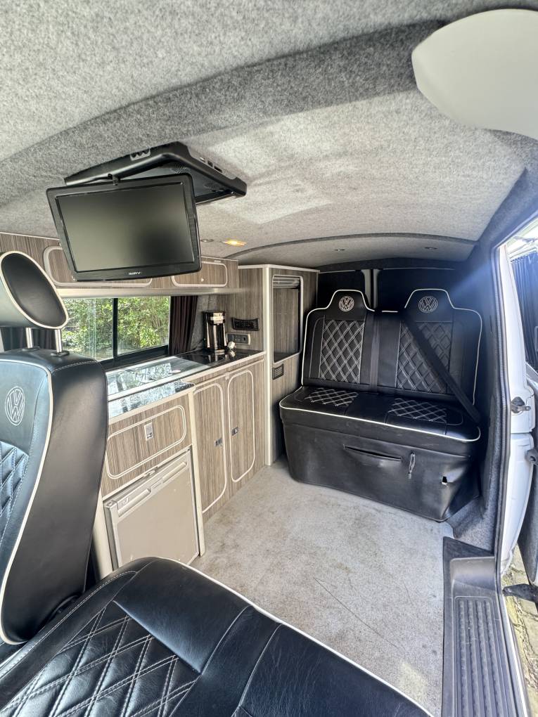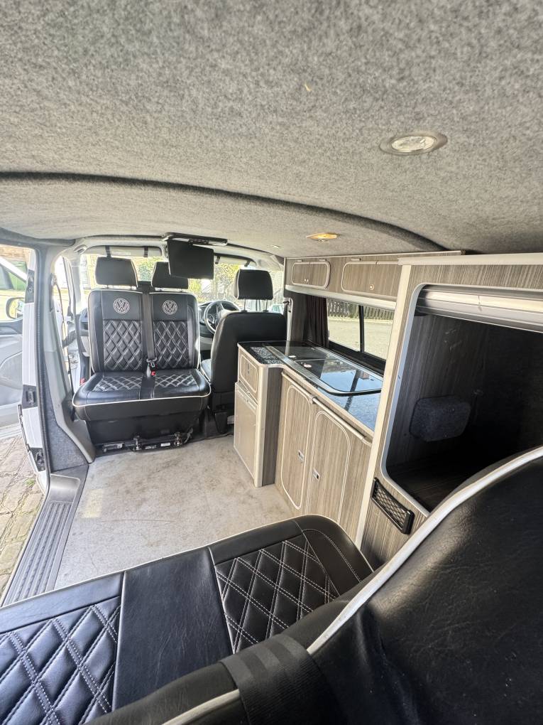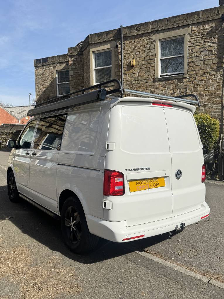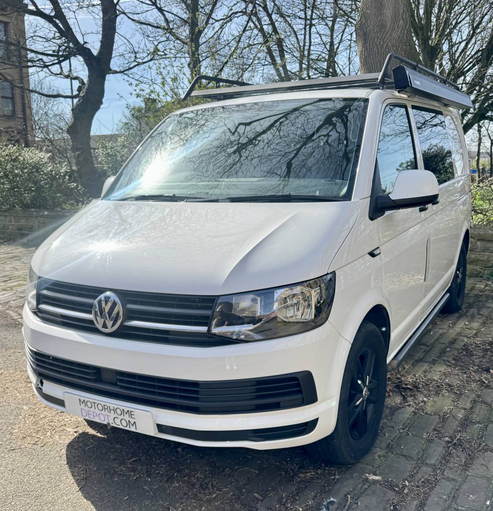 Motorhome Depot Wakefield are pleased to present this VW T6i Camper in White. This beautiful camper comes with 2 ring gas burner hob and sink, 12v fridge, Rear Double Seat with 2 belts Rock and Roll bed, Matching upholstery throughout in black, TV, water tanks, Porti Poti, Roof Rack, Tow Bar and Portable gas powered shower.