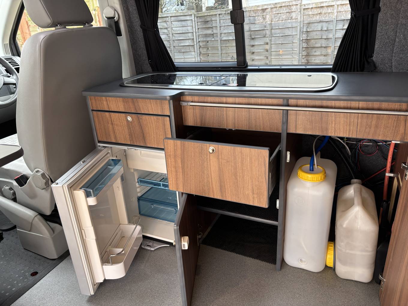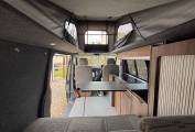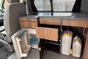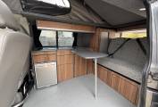 Inside the campervan along the far side, there is a built in unit with worktop, double gas hob, sink with tap, Dometic fridge with icebox, fresh water and grey waste water containers, various storage compartments, the 12 volt unit control and a multi position rail for the detachable stow away table for dining and relaxing.