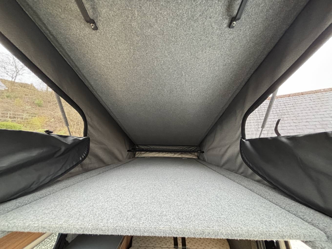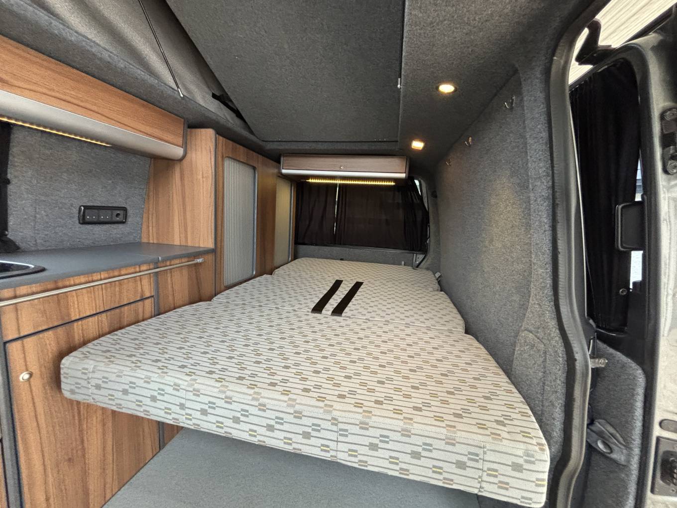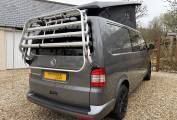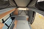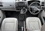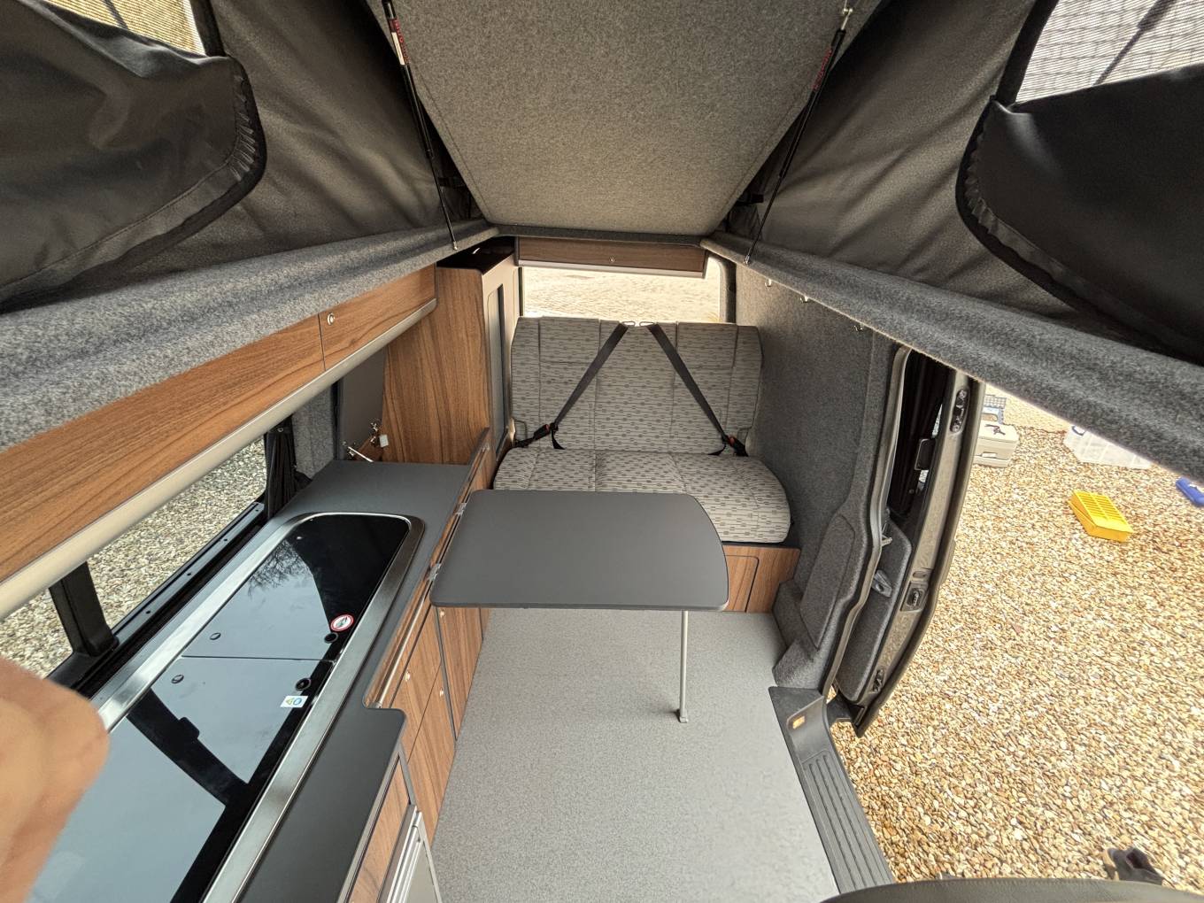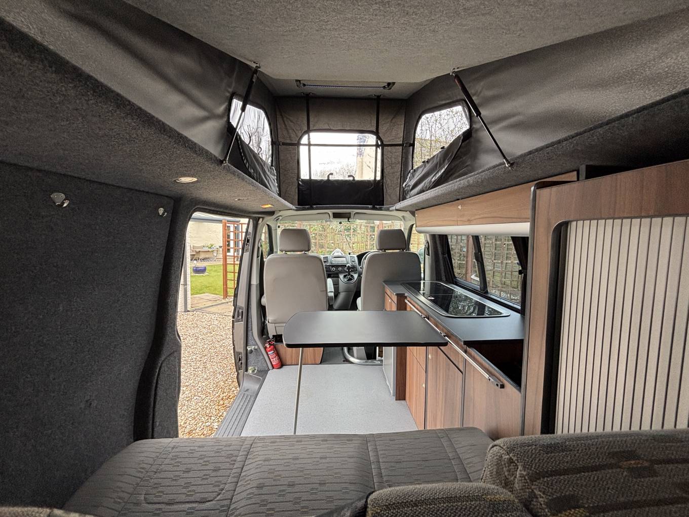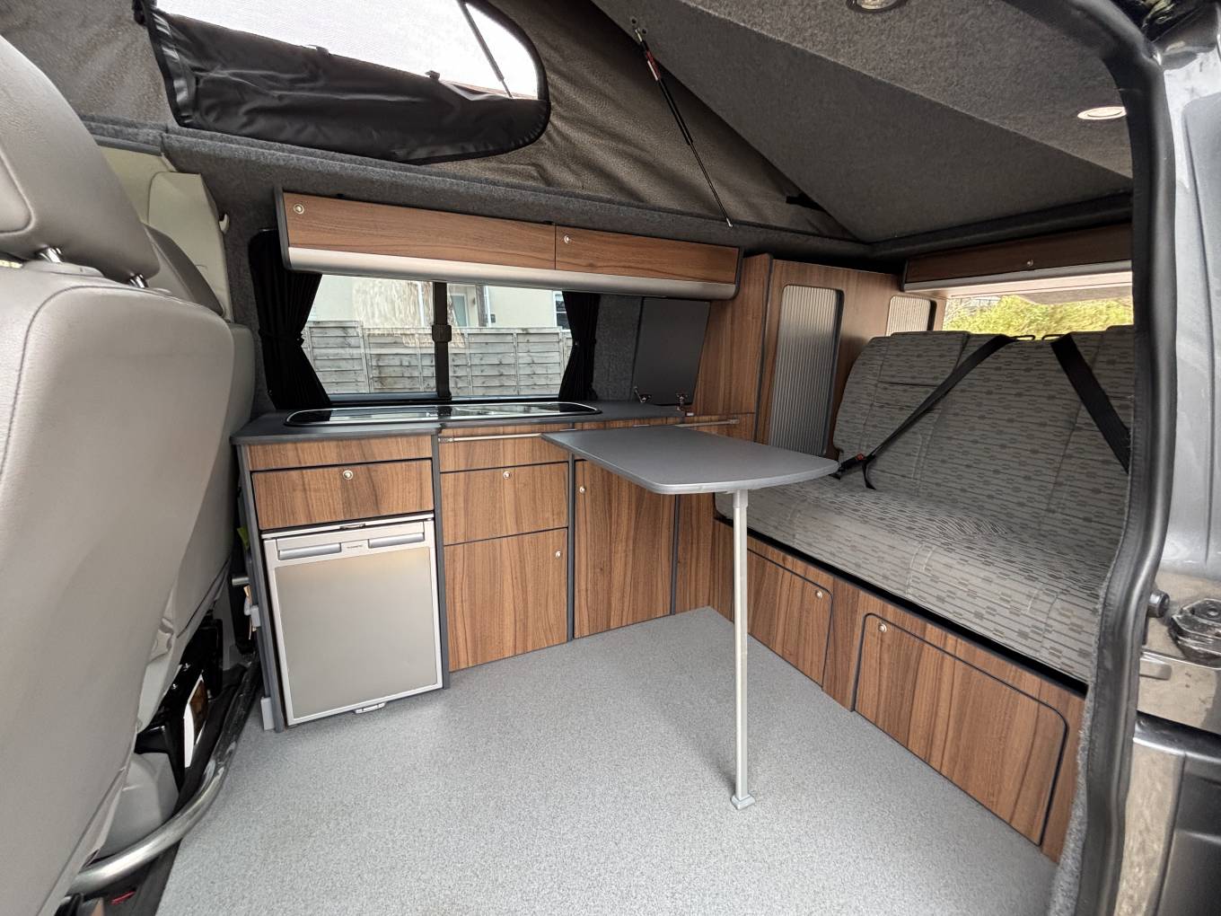 To the rear, there is also the Rock n roll seat with 2 travelling belts and further storage below, which nicely converts to a double bed for sleeping. For further relaxation within the van the front passenger seat is on a swivel base and has a movable table for convenience which can be stowed away when not in use. Being on the long wheel base, there is extra space between the seating areas, along with the pop top with zip down blinds for extra headroom, that can easily be converted to an extra sleeping space for two.