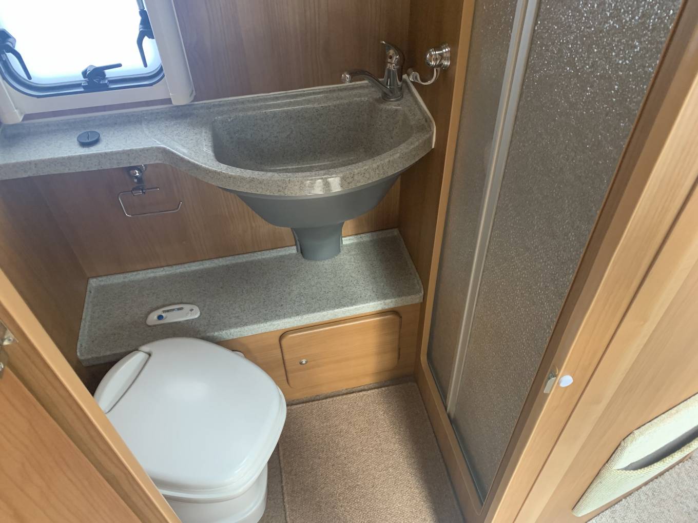 The washroom includes sink, cassette toilet, then shower,