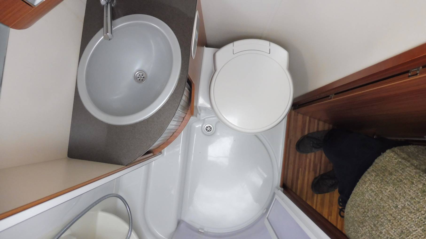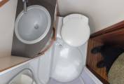 The washroom is positioned centrally and consists of a vanity unit with a handwash basin and wall-mounted unit, a Thetford cassette toilet and a separate shower cubicle.