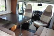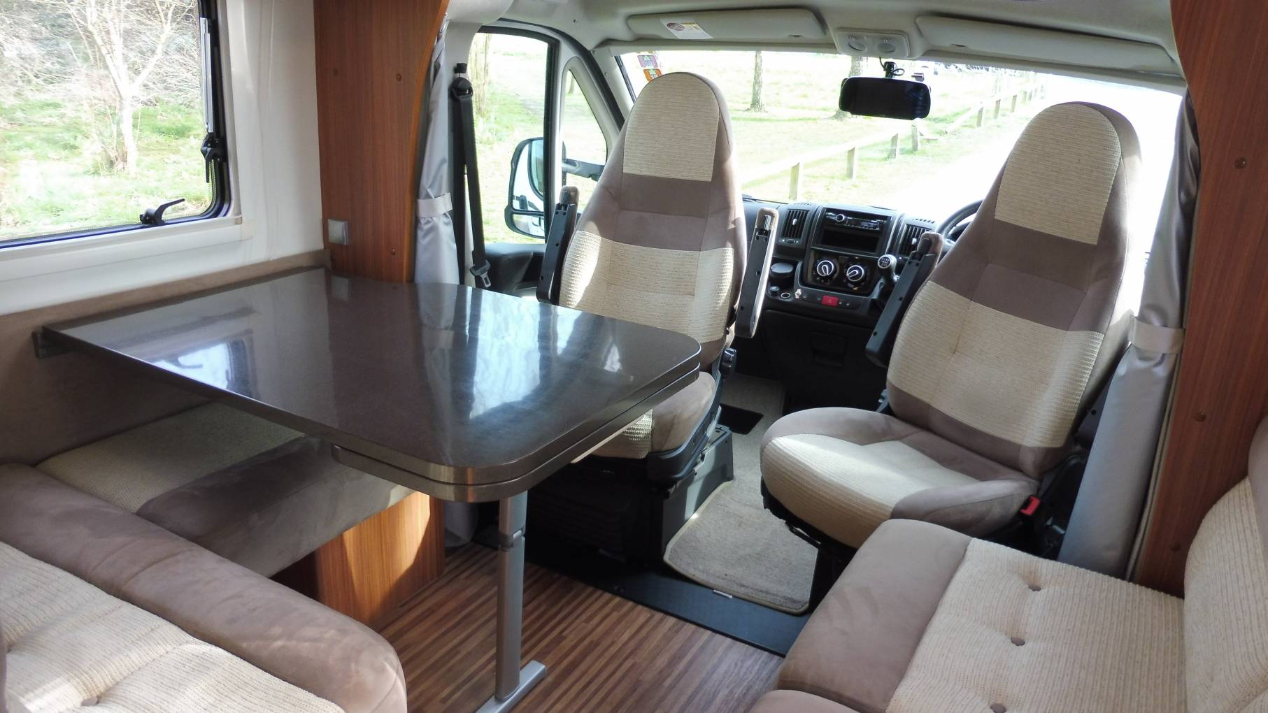 To the front you will find the lounge area with an L-shaped dinette with two 3-point seat belts, a side-facing sofa which can be configured for an additional traveller with a lap-belt. Two swivel Captain seats provides adequate seating for 6 to dine around an extendable table.