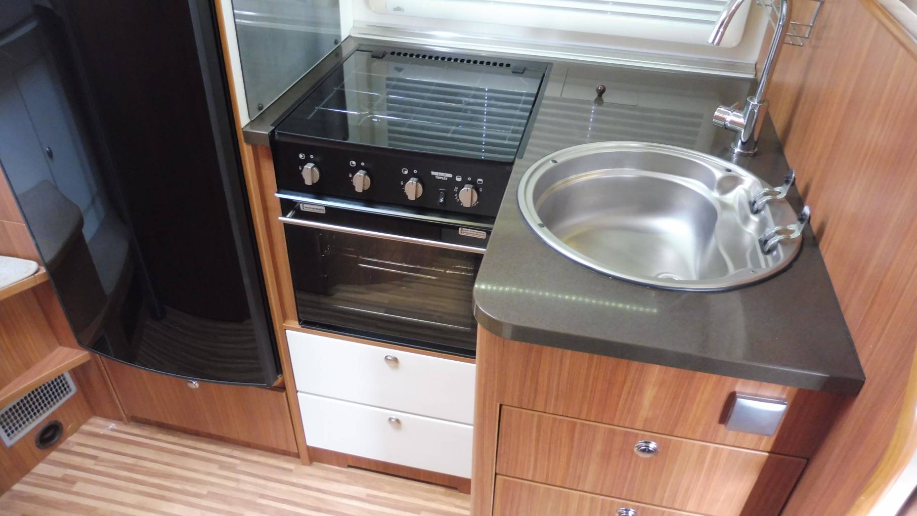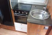 Adjacent is the kitchen which provides a combined oven and grill, stainless steel sink with mixer tap, a large fridge with integrated freezer compartment and storage at both floor and eye level.