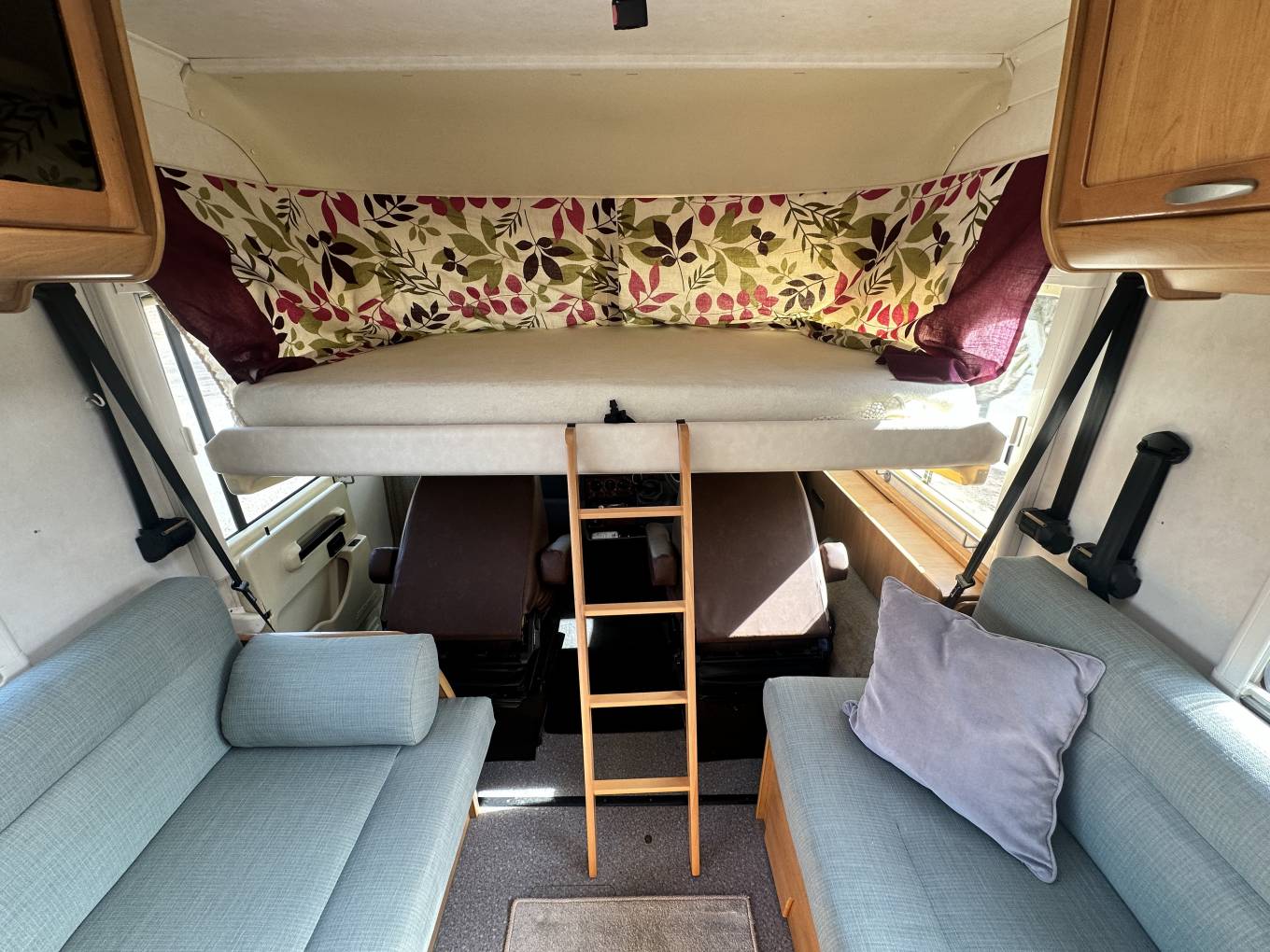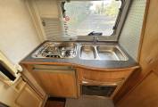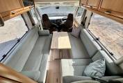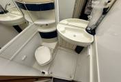 As you enter the through habitation door via the electric step you are greeted by the galley style kitchen including a 3 gas burner hob, a double stainless sink with chrome mixer tap, fridge with ice box, oven/grill and plenty of storage. Moving forward you will find the well designed bathroom including Thetford cassette toilet with fresh water flush, sink with chrome mixer tap, a shower head which extends from the mixer tap and a cleverly designed rotating wall to make the shower cubicle separate from the toilet. In the heart of the motorhome, you will find the light and airy dinette area complete with a large L-shaped sofa and side sofa. There is a practical freestanding table which can be used and storage away when not needed. When evening nears, this area easily converts into a comfortable double bed or could also be used as a single and a double. Finally over the cab is a full width double drop down bed completing this 5 berth motorhome.