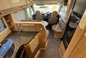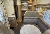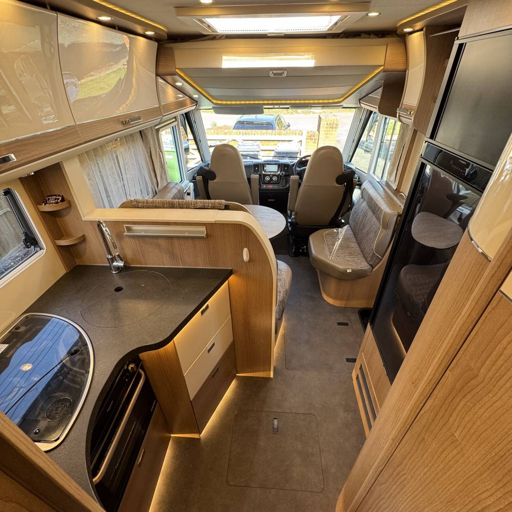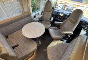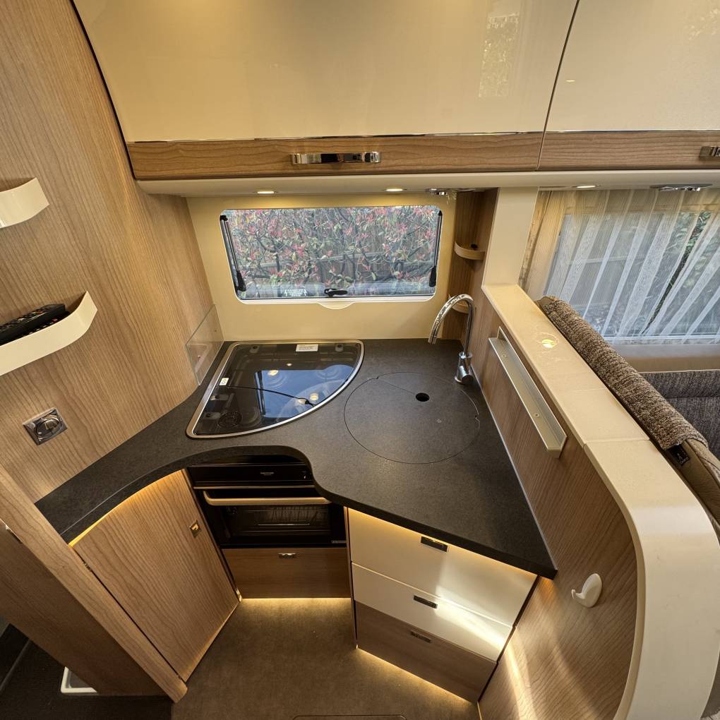 The Malibu I 500QB has a wonderful living area giving you all the luxury and comfort you could wish for. At the front you have a lounge/dining area making use of the large captain chairs, L shaped sofa and a further side sofa. The current owner have put in a smaller table top for increased space but has the larger table should you prefer. Moving back there is a well equipped kitchen which includes gas hob and sink on one side and a large fridge with separate freezer and oven and grill on the other. There is loads of cupboards and storage space for all your utensils and ingredients.