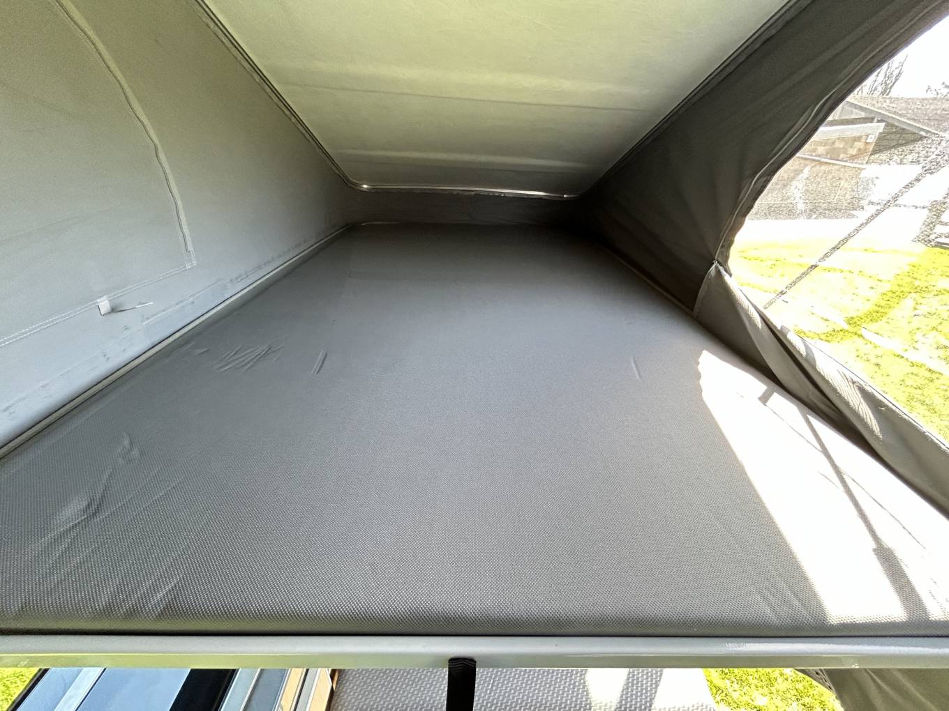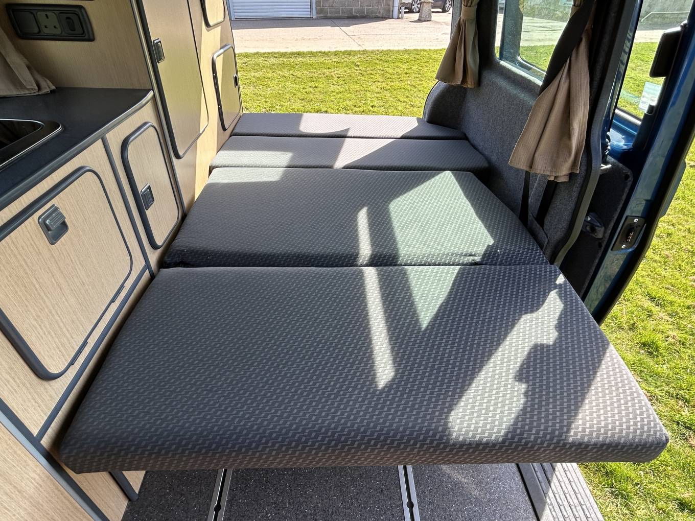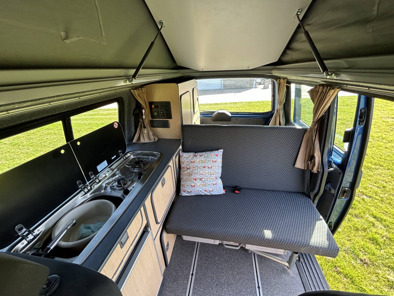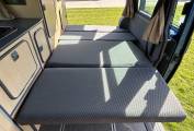 The bed in the pop top roof will sleep 2 adults but is designed with young children in mind while mum and dad sleep on the bed below.