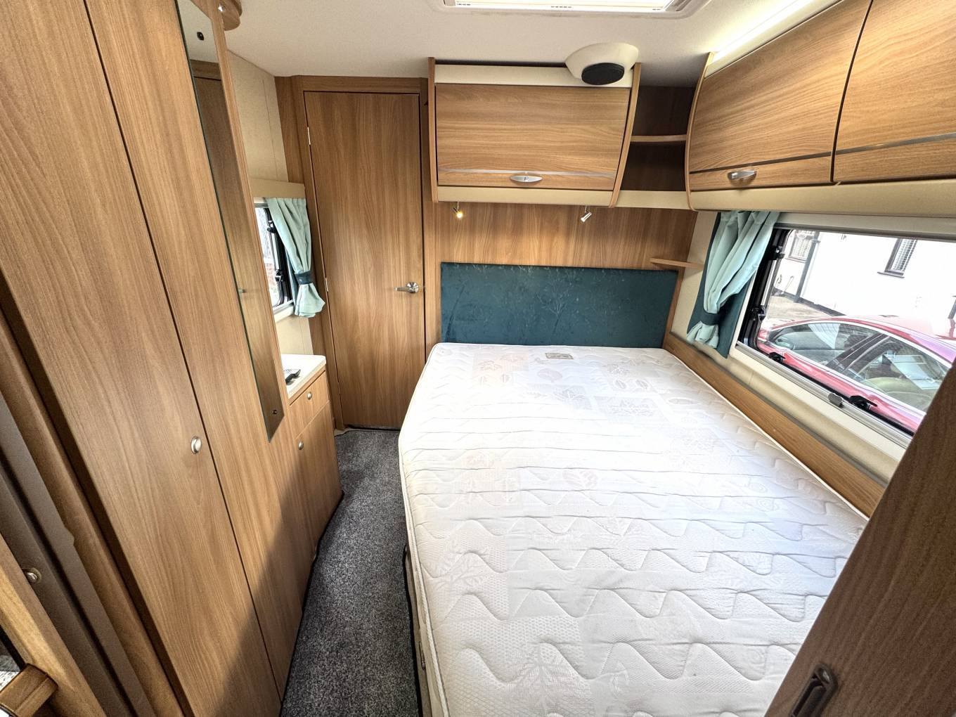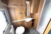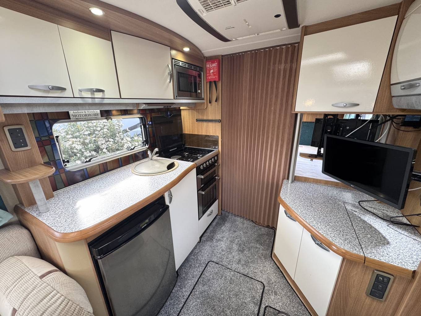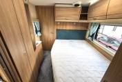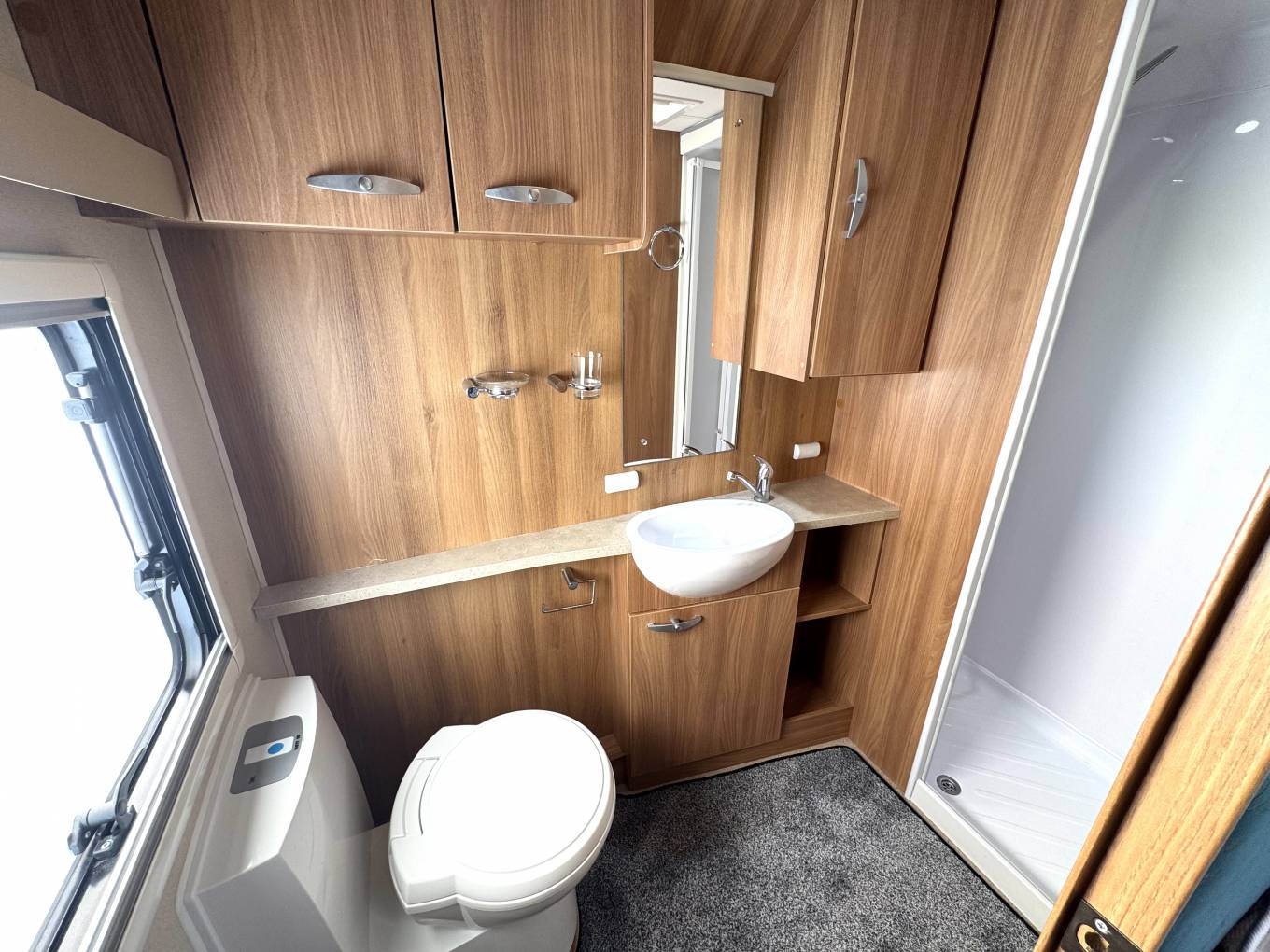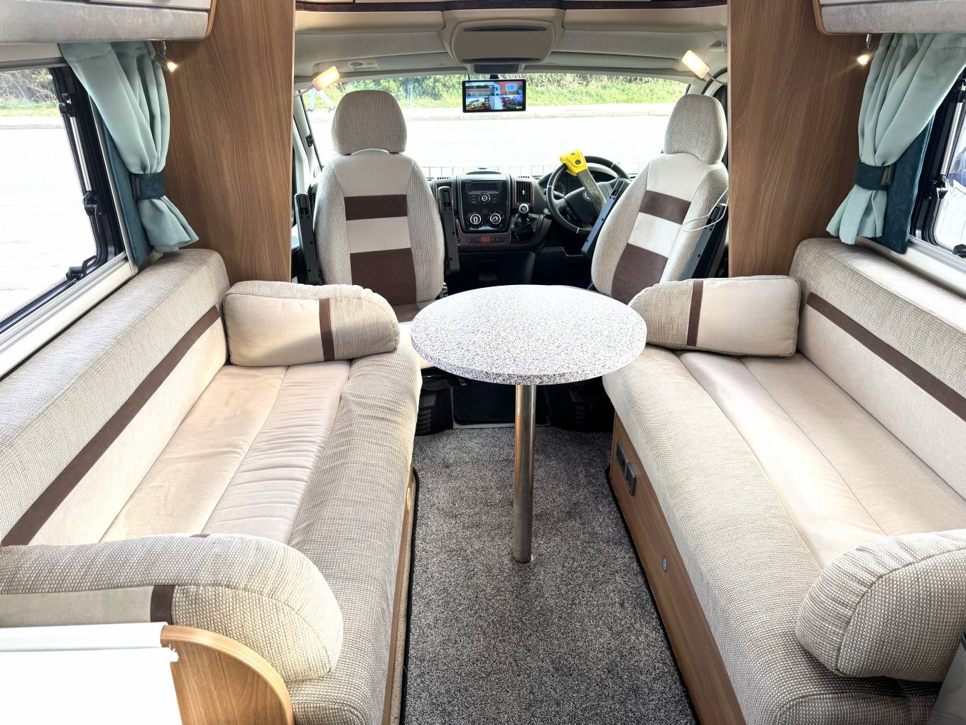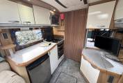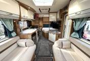 The spacious interior provides a comfortable and practical layout. With two seat belts and sleeping space for four, it’s ideal for families or couples looking for luxury on the road. The fixed rear double bed and convertible lounge bed ensure a restful night’s sleep, while the high-spec kitchen includes a full oven, grill, gas and electric hob, microwave, and a large fridge/freezer. A huge separate washroom is at the rear with a Thetford cassette toilet and a fully enclosed shower adds to the convenience. Heating and hot water are provided by a Truma Combi 6 system. Large welcoming windows with fly screens and blackout blinds offer excellent insulation and privacy.