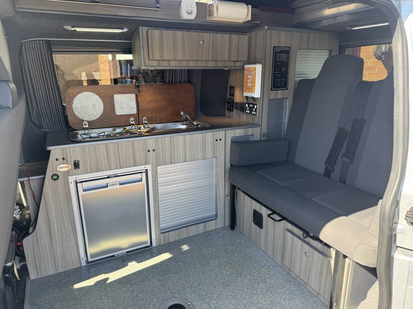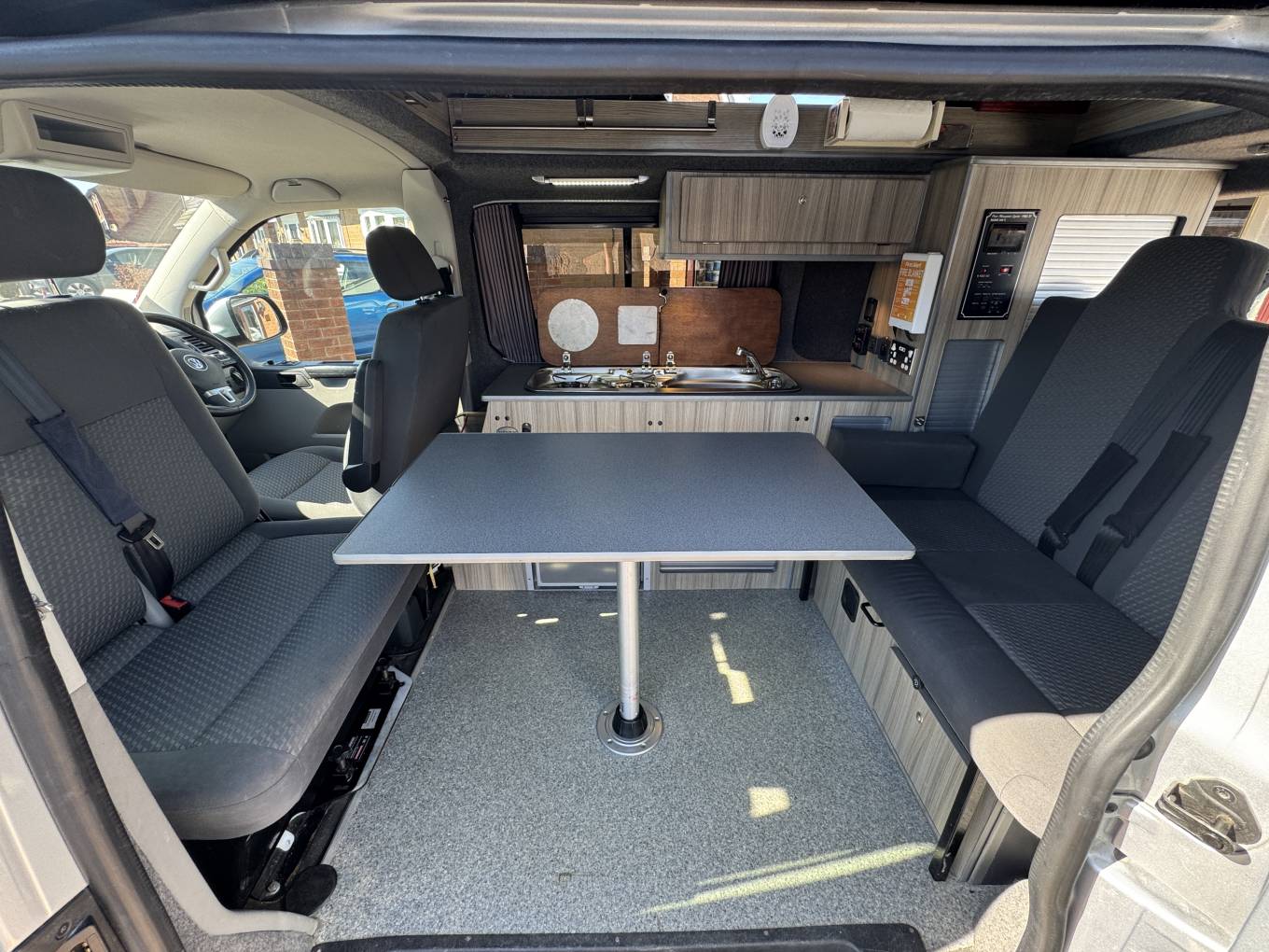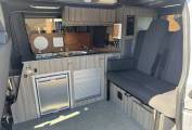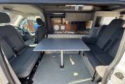 This high level quality conversion offers a 2 berth sleeping capacity along with 5 travelling seats. The cab which boasts 3 of the 5 travelling seats also has the passenger swivel plate that can be turned around to face the centre dinette and the remaining 2 travelling seats. In the Cab there is a touch screen interface which includes radio, CD player, bluetooth and A/C. There are also electric windows and mirrors along with cruise control.