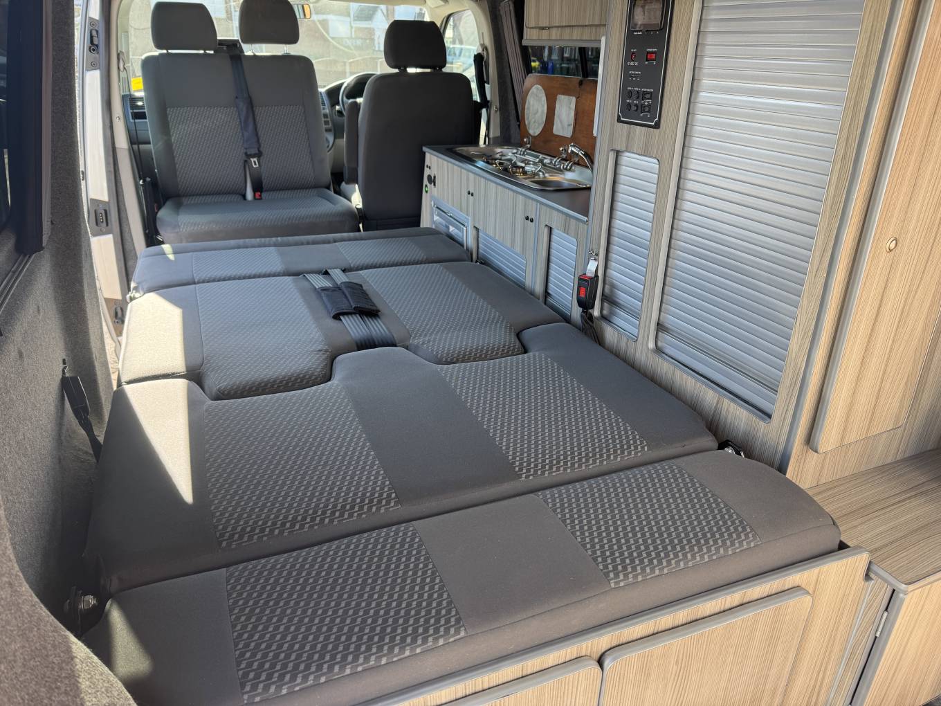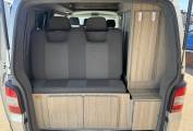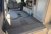 The rear 2 travelling seats pull forward to make the large double rock and roll bed with storage around each side and underneath.