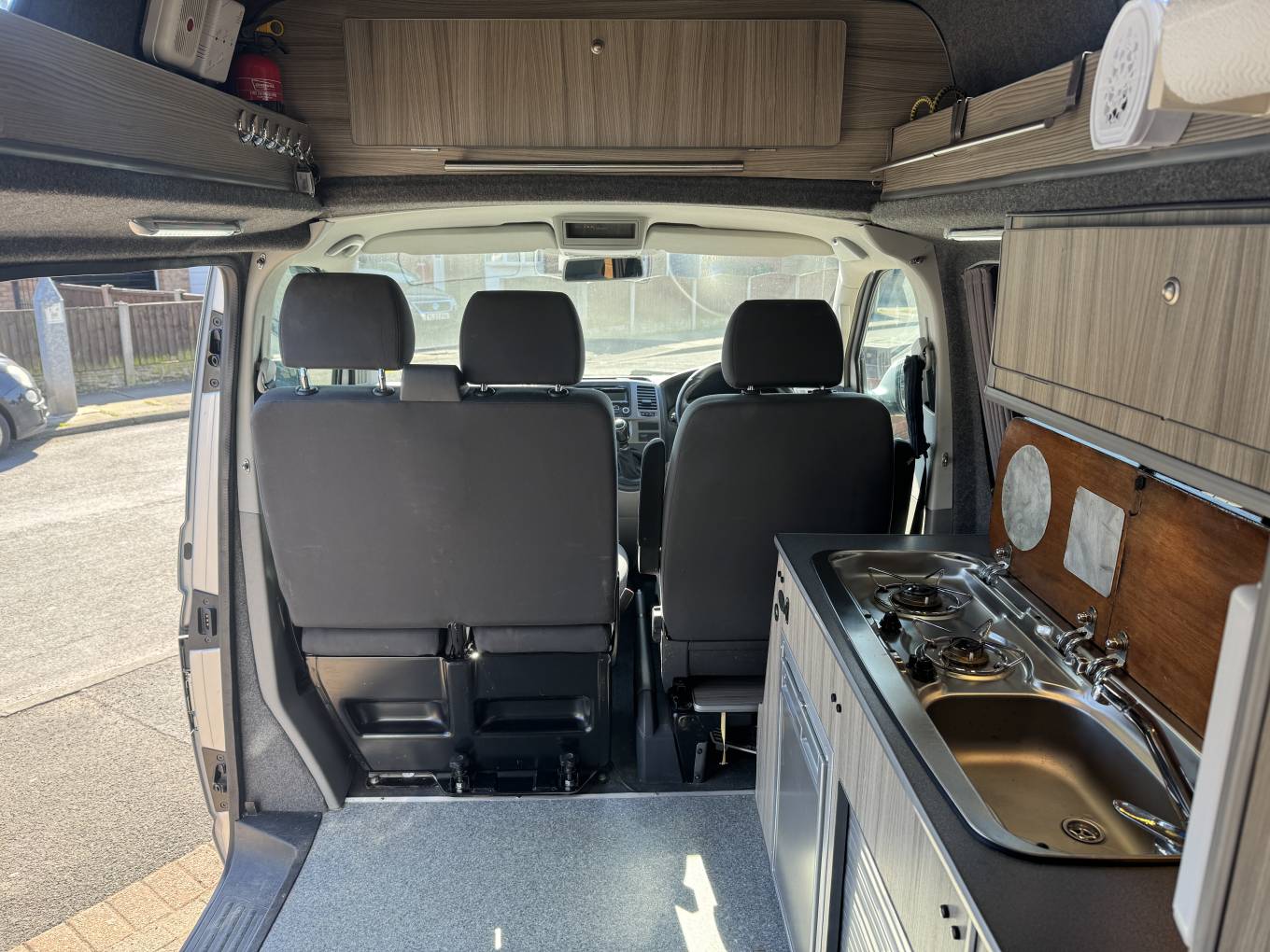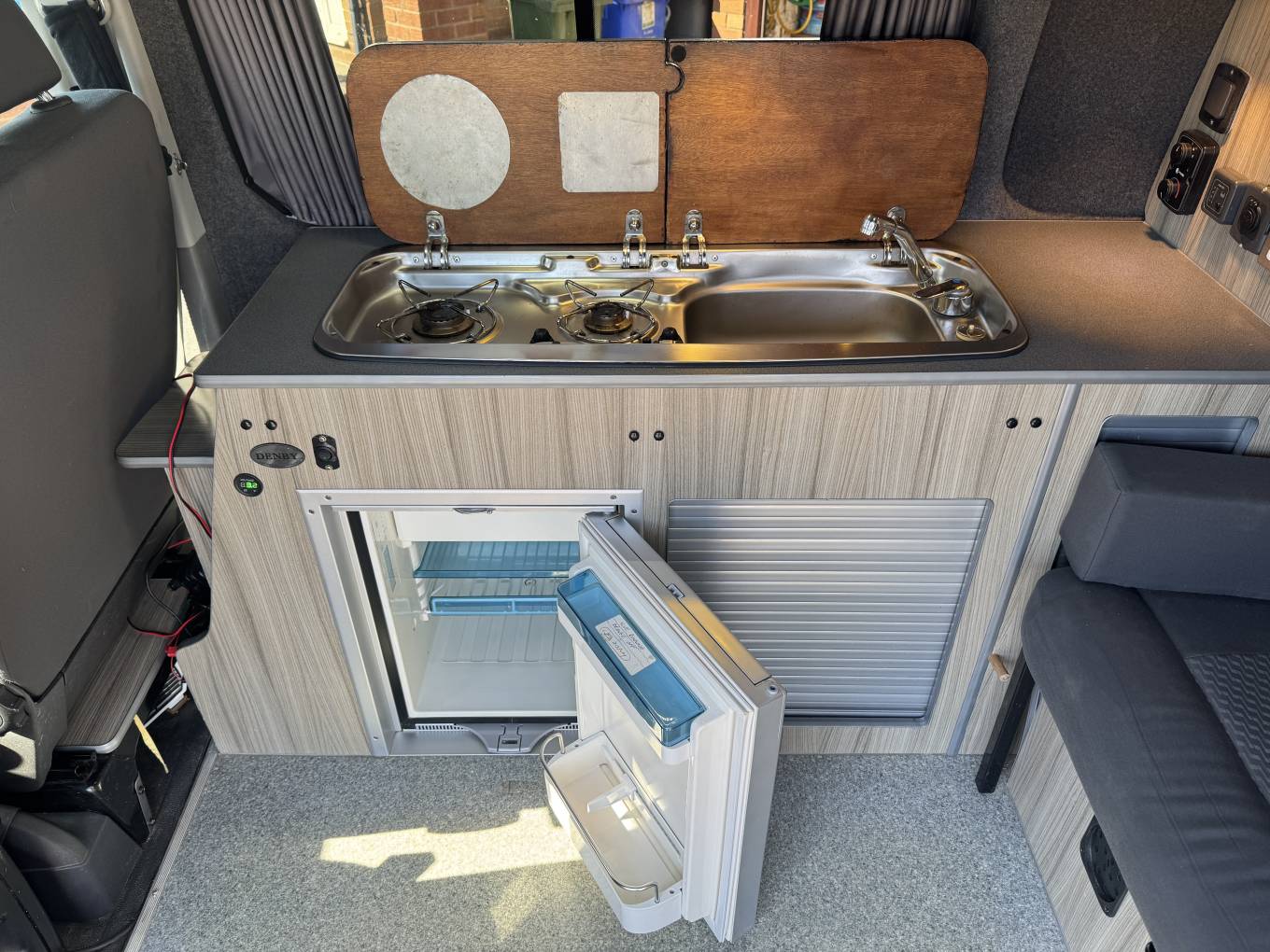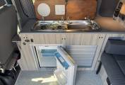 The centre dinette includes 2 ring gas hob, stainless steel sink and a good sized fridge with freezer compartment. In this area, there is a removable dining table which is positioned between the 4 travelling seats. .