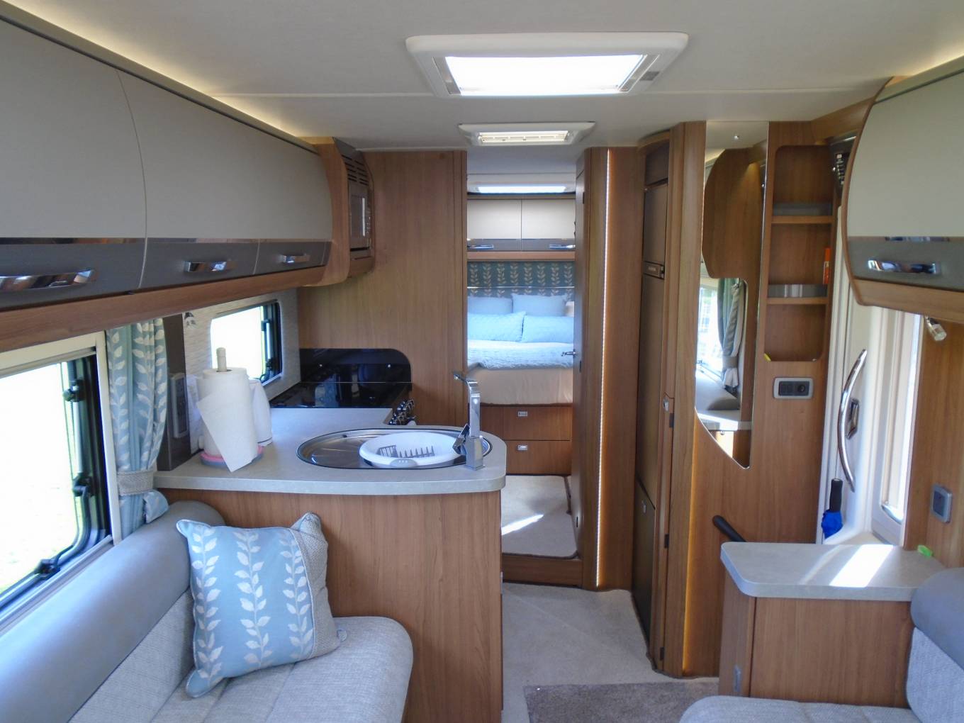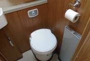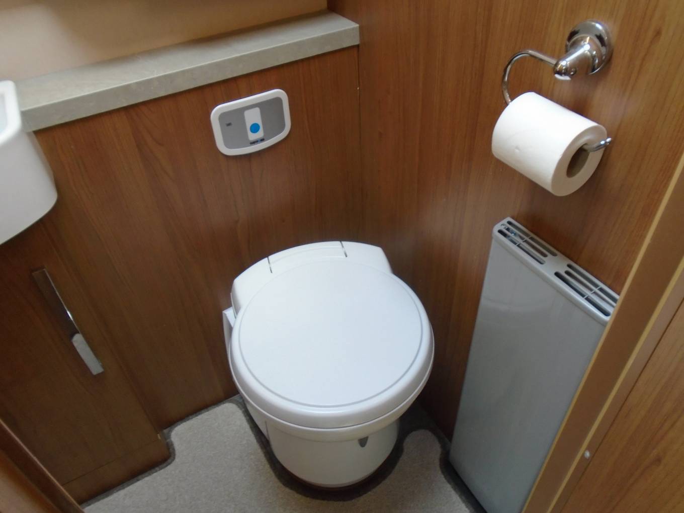 The Washroom: Separate shower cubicle with perspex shower doors on the off-side. Near-side a Thetford cassette swivelling toilet / electric flush, built-in washbasin / chrome mixer tap, storage cabinet. Privacy door to the toilet & sections off rear.