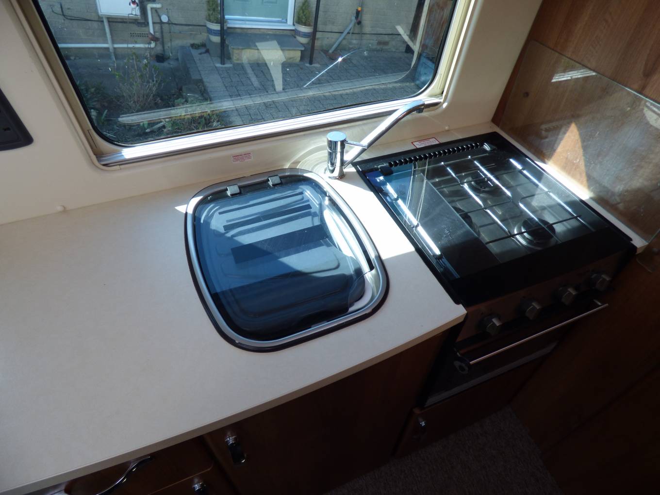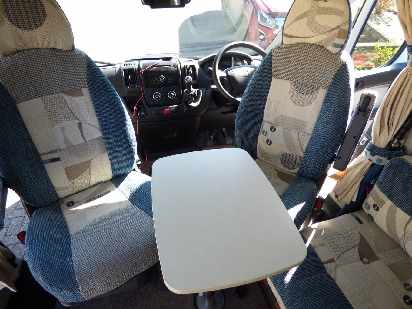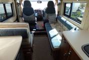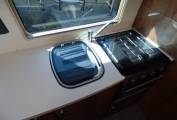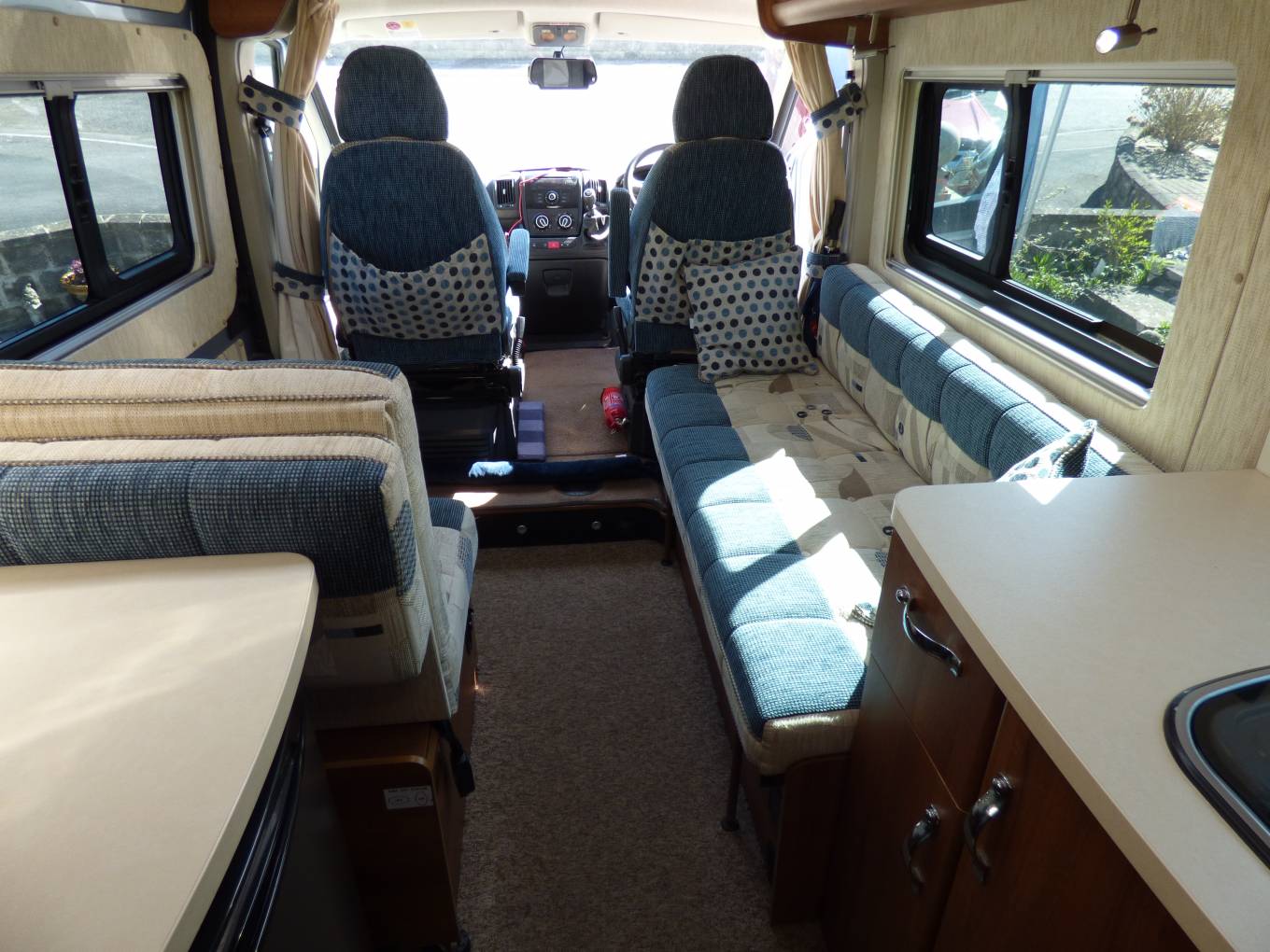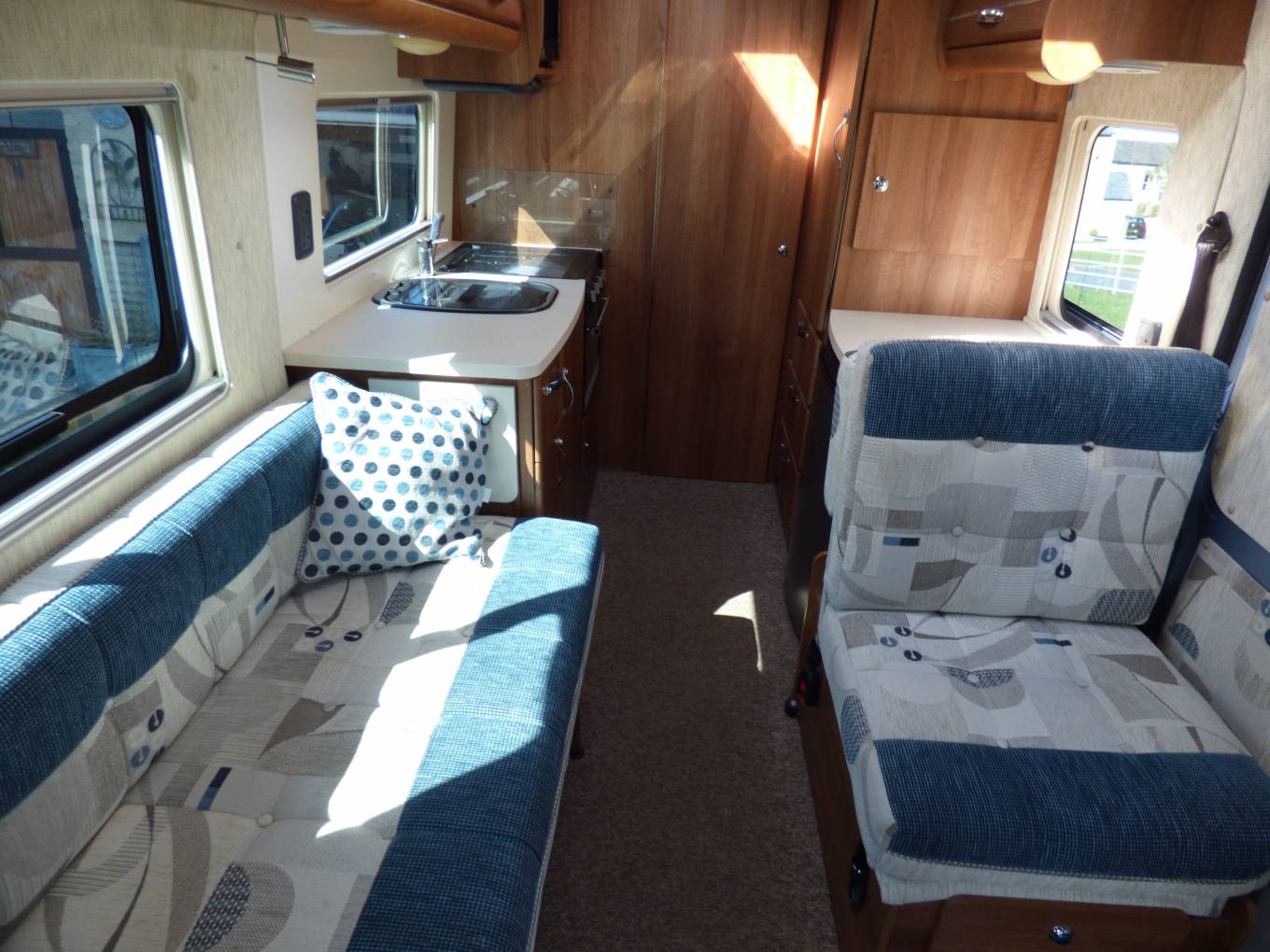 The habitation is very light and airy with a large Heki style roof light and side windows. The two front seats swivel round to face the interior of the habitation so allowing accommodation around the detachable table for around 4 people. The kitchen is well fitted with fridge, hob, sink and microwave. The vehicle also has an onboard LPG tank and an external BBQ point.
