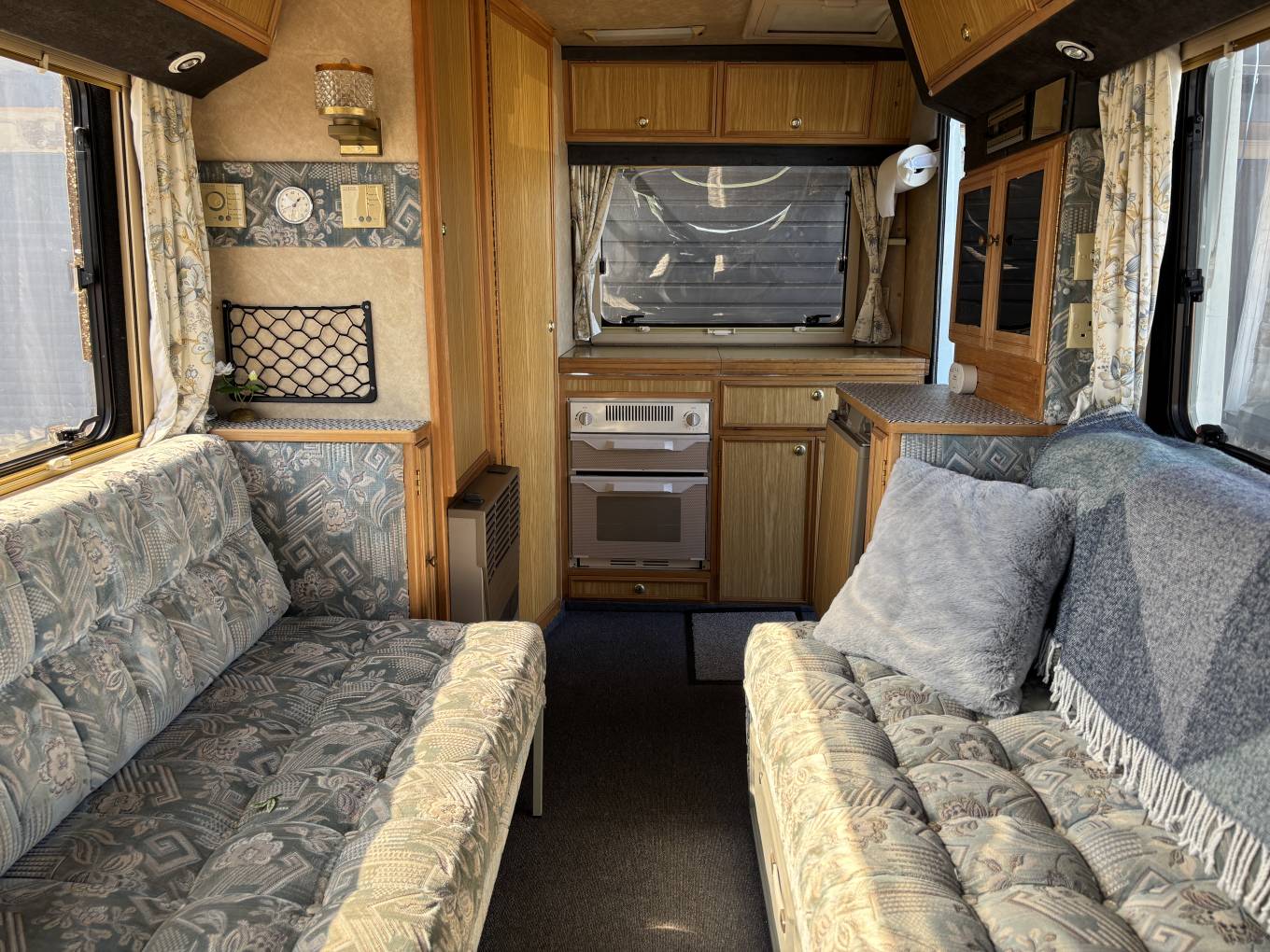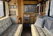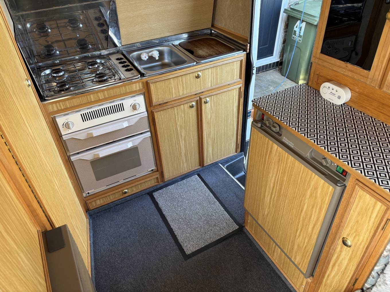 The well-equipped kitchen includes a full oven, grill, 4-burner hob, and a three-way fridge, giving you everything needed to prepare meals on the go. There’s also ample worktop space and well-organized storage throughout the kitchen area.