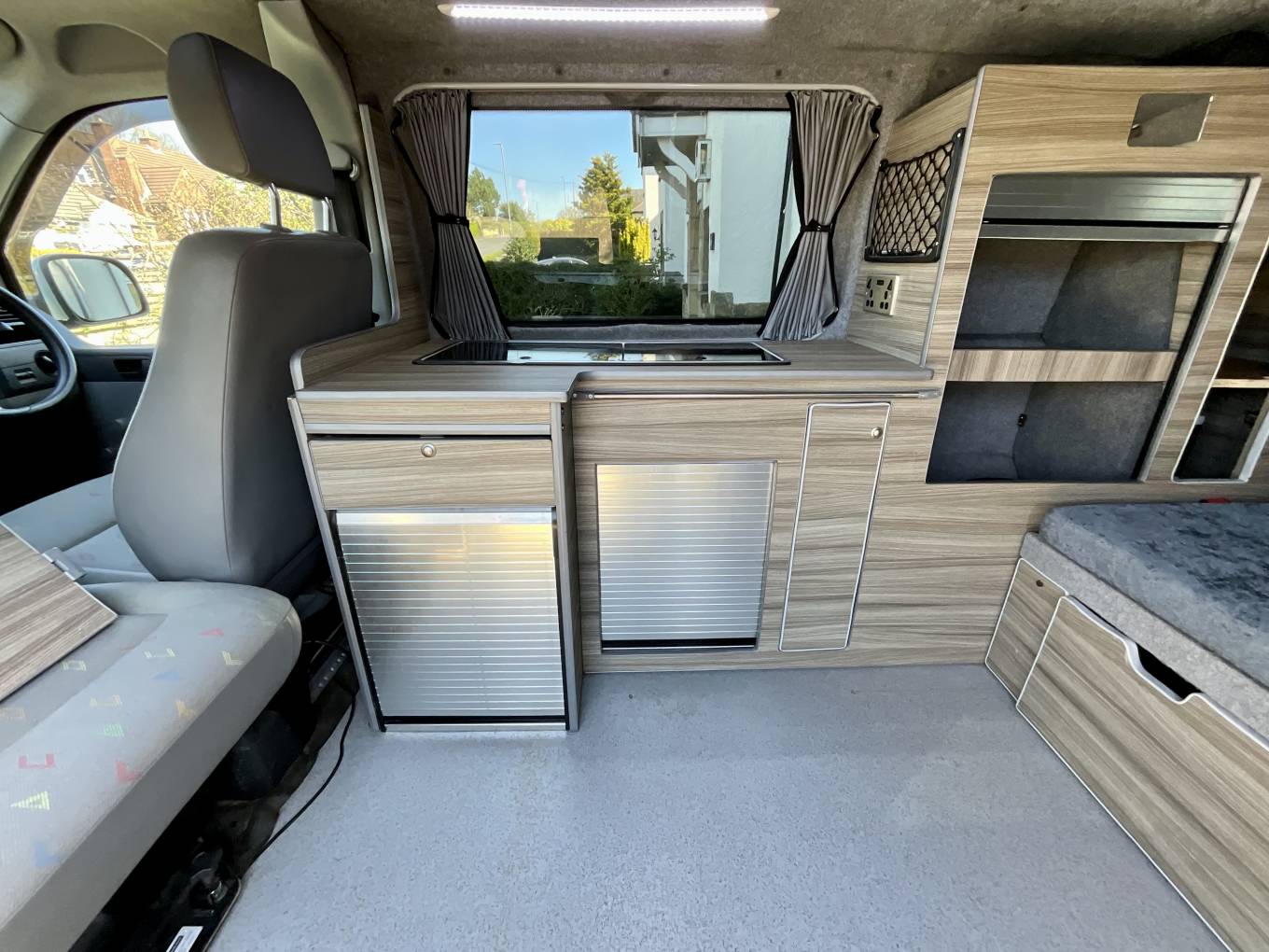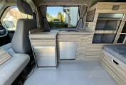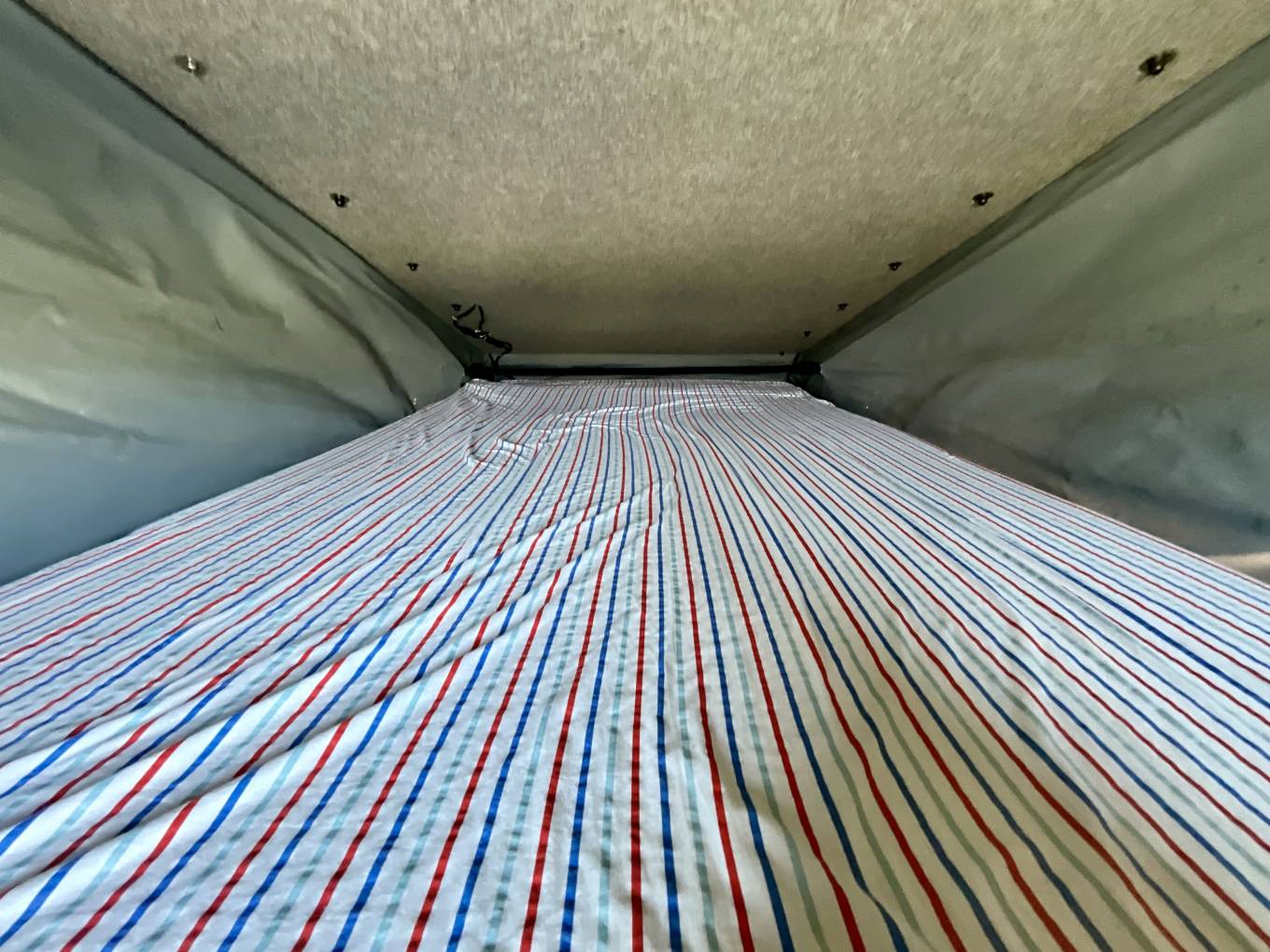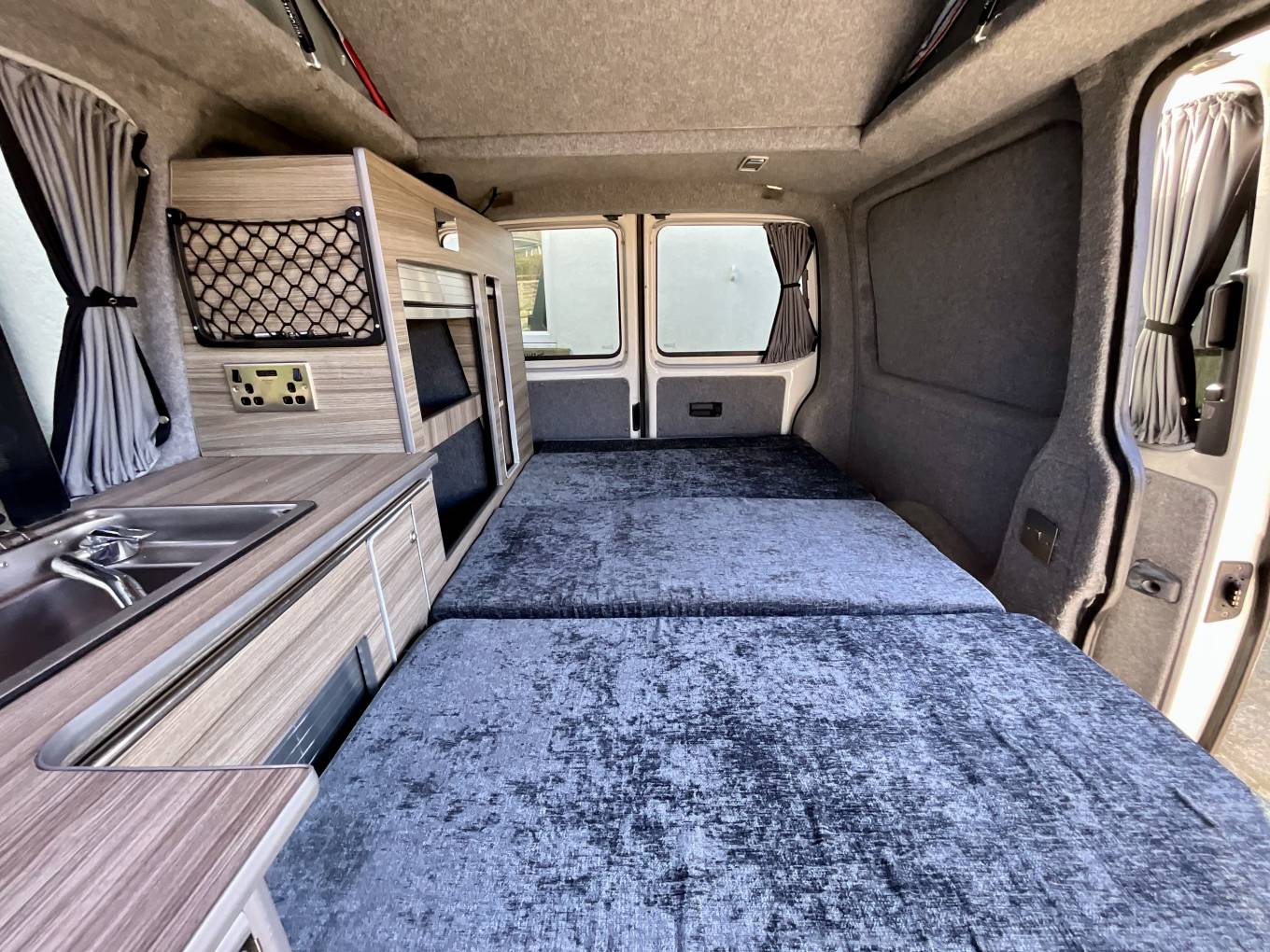 The rear bench can easily fold down into a large double bed at night, and the pop top extends to allow plenty of head room to move around in the van, and a sizeable bed for two more, making this campervan a four berth.
