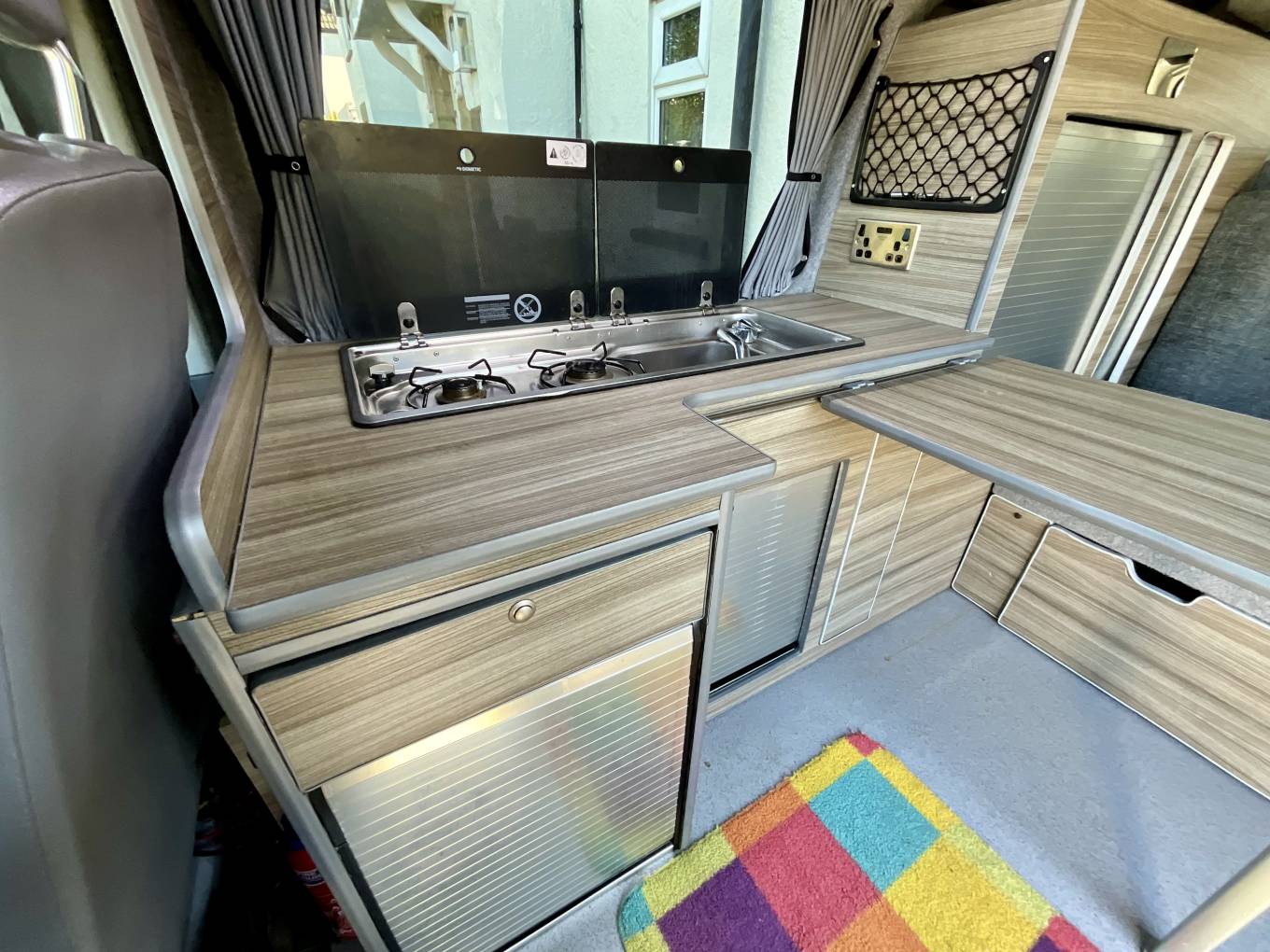 A Kiravan bench swivel seat forms the lounge, with a fold out table that clips in the middle. The kitchen is equipped with gas hobs, sink with tap and water pump that feeds to the fresh water container below. A 12v/240v coolbox acts as your fridge and is more spacious than most fridge units.