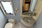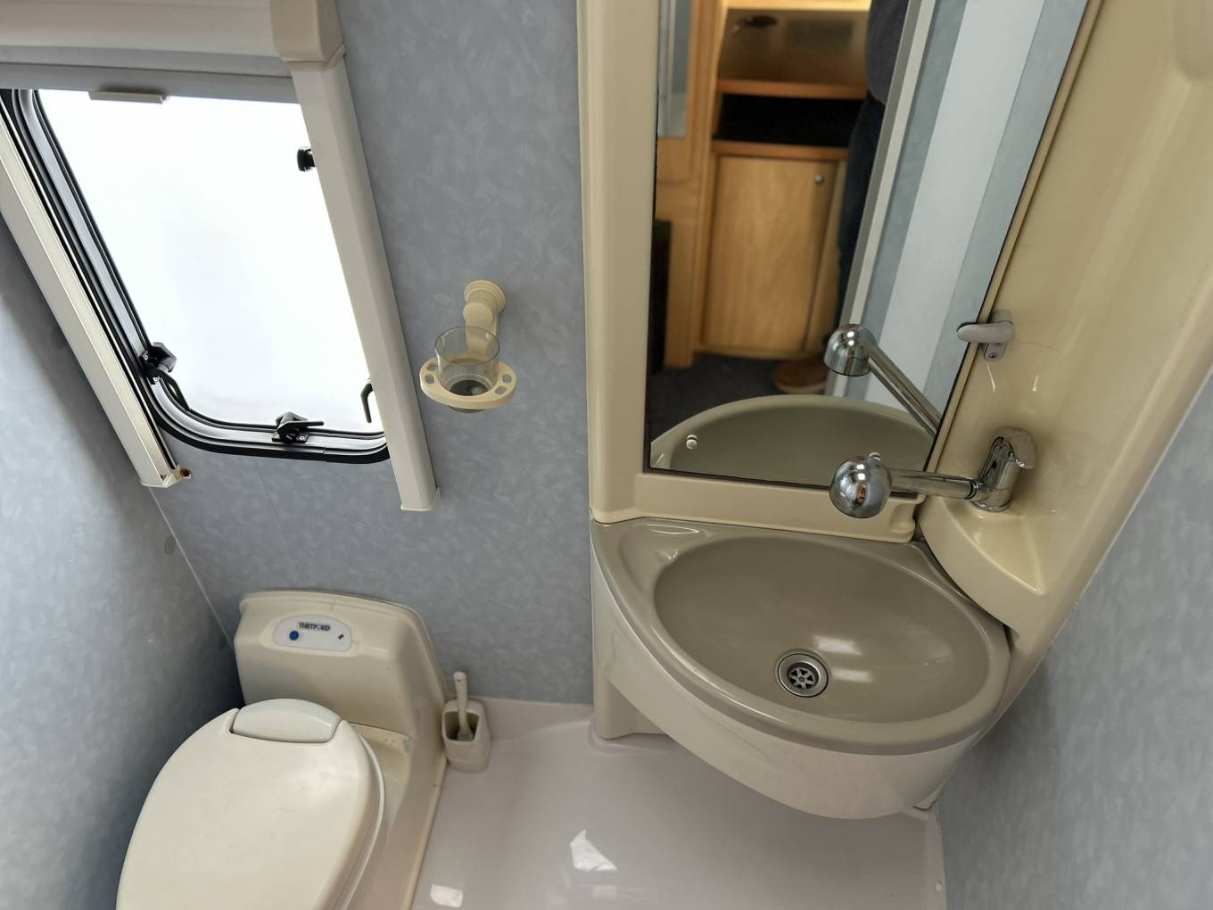 The spacious wash room consists of cassette toilet, shower, hand basin and mirror.