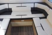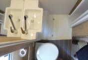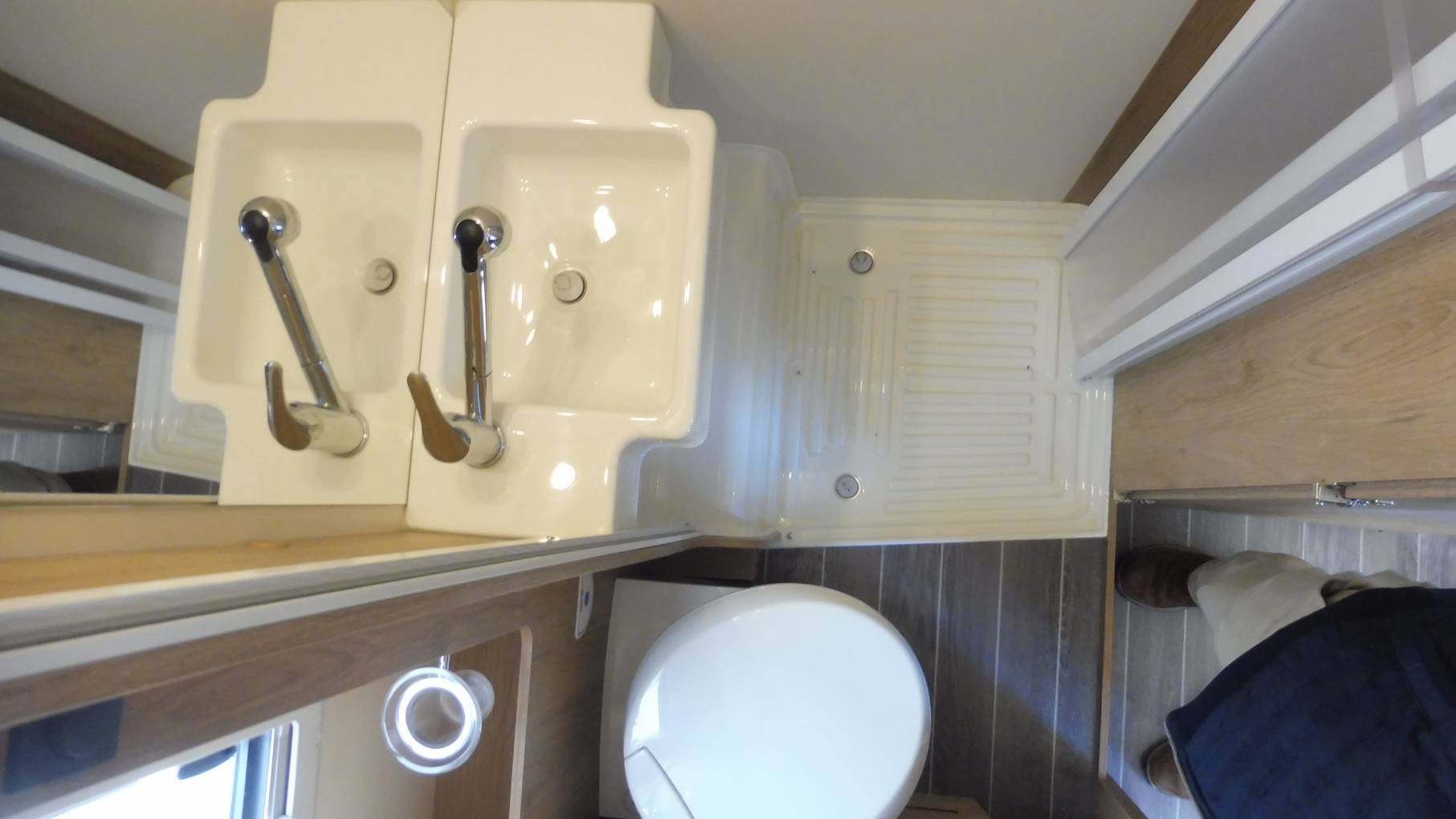 As you move forward you come to a modern well equipped kitchen area, offering budding chefs an oven & grill, 3 gas burners, 3-way fridge with freezer, and round stainless steel sink with mixer tap. The kitchen area also boasts ample storage space to keep your all your food and crockery etc. Opposite the kitchen is the washroom equipped with a swivel style cassette toilet with electric flush, shower cubicle with a handwash basin.