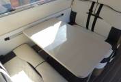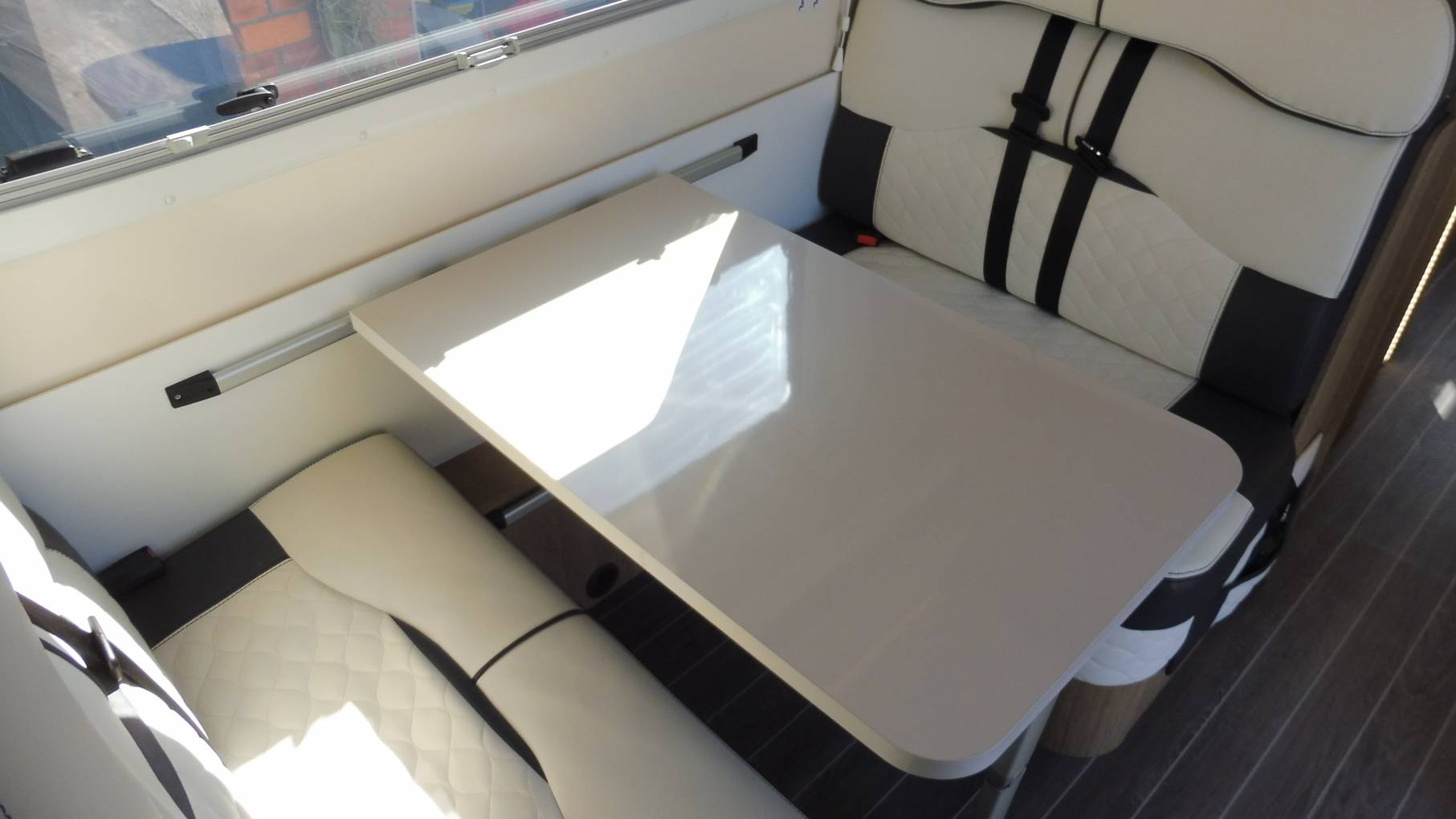 At the front is the dinette area which offers three 3-point seatbelts and is the ideal place for mealtimes whilst on the opposite wall is a cabinet with TV bracket. This dinette easily converts to a double bed.