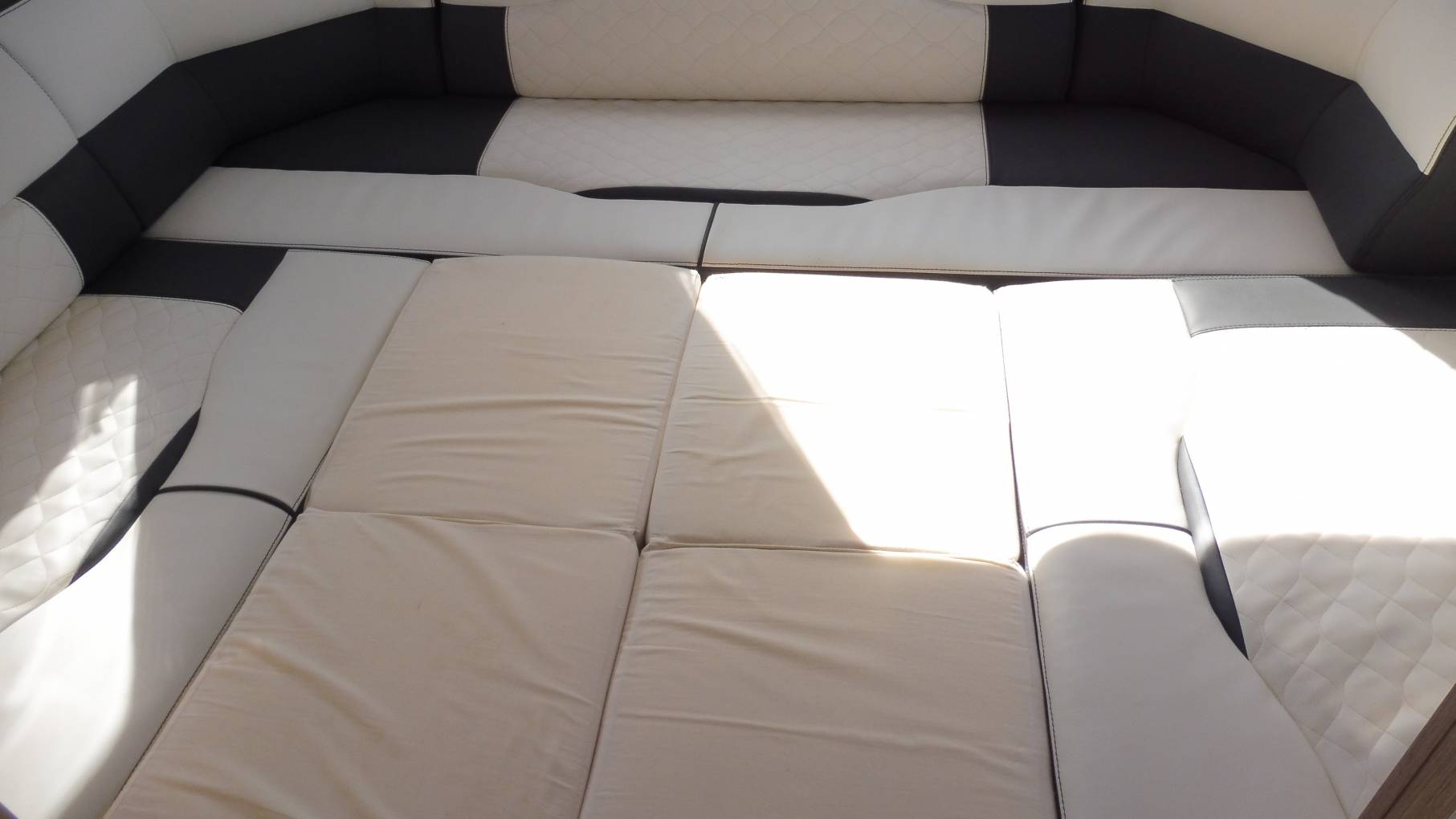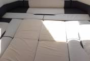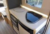 Internally there is a highly contemporary feel with high gloss cabinetry, white furnishings and black contrasts. The main feature is the extremely spacious U-shaped lounge situated at the rear of the van. The large and comfortable sofas give you the perfect place to sit and relax after a day's activities. Natural light floods from the three windows and the large rooflight above and at night this area then converts to one extremely large and comfortable double bed.
