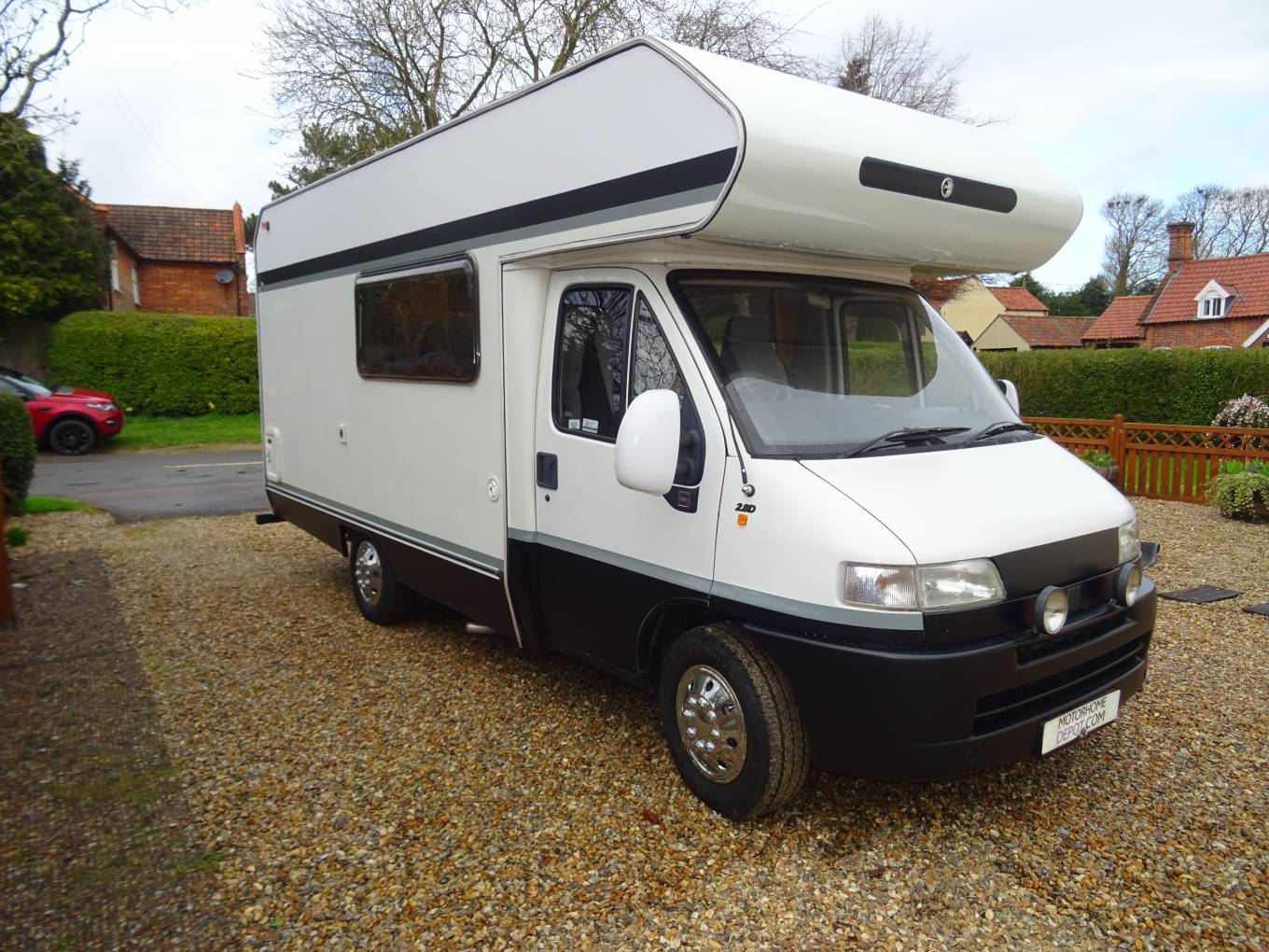 Swift Royal 4 Berth 2001 with 5 speed manual gearbox 2.8cc engine, comprehensive service history, This spacious motor home has got a few high moisture readings and possibly had a few issues in the past. As you enter the side door, to the right you have a large lounge area with one long lounger seat and a dining area opposite that makes into a large double bed. At the rear is the well equipped kitchen, laid out with sink with mixer tap, oven, grill, 3 ring gas hob and fridge with freezer. The washroom is spacious with shower and vanity unit. Outside there is a bike rack and tow bar. It has had some work caried out, please ask for pictures and last report. There are some issues showing on the report. Located in Norfolk.