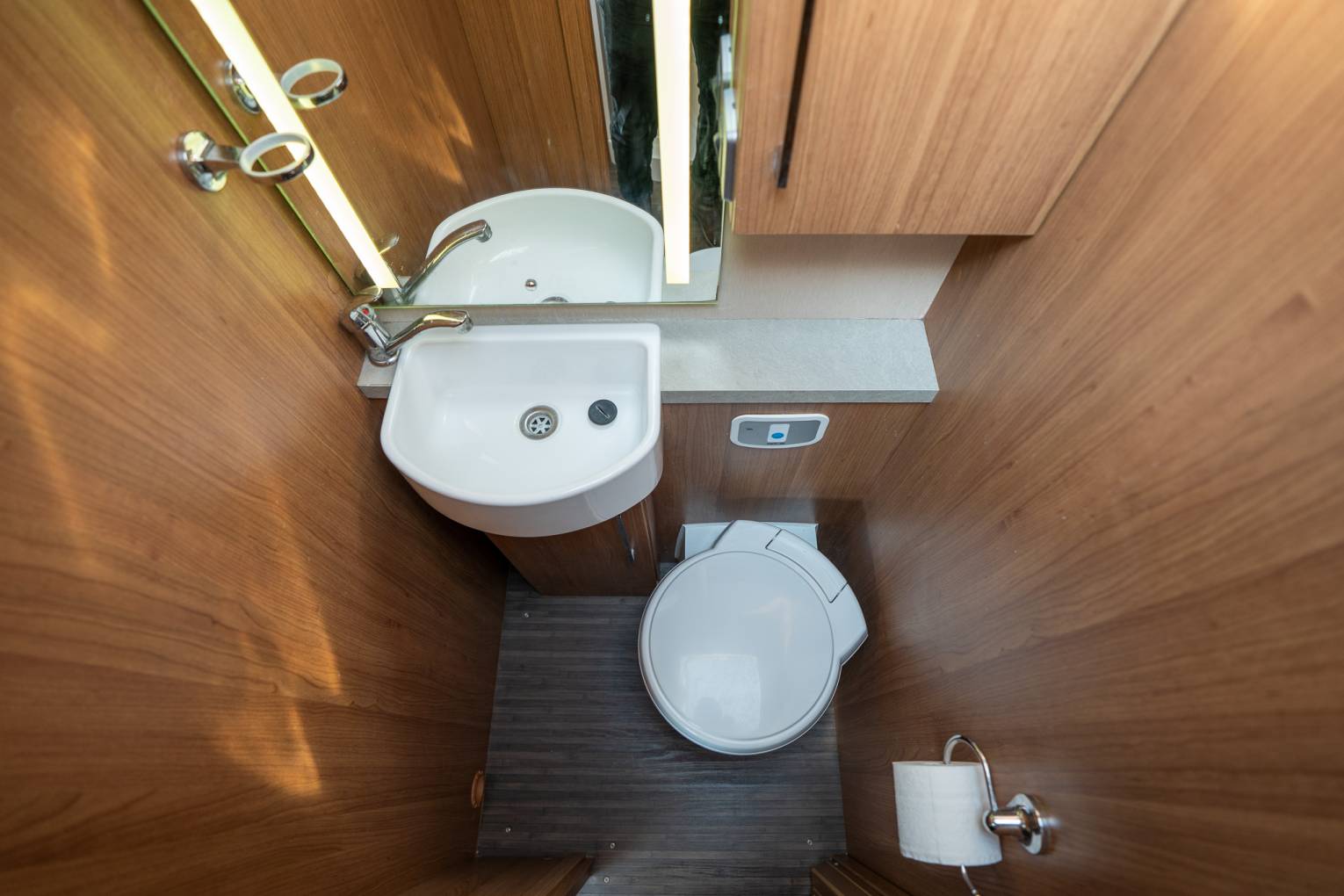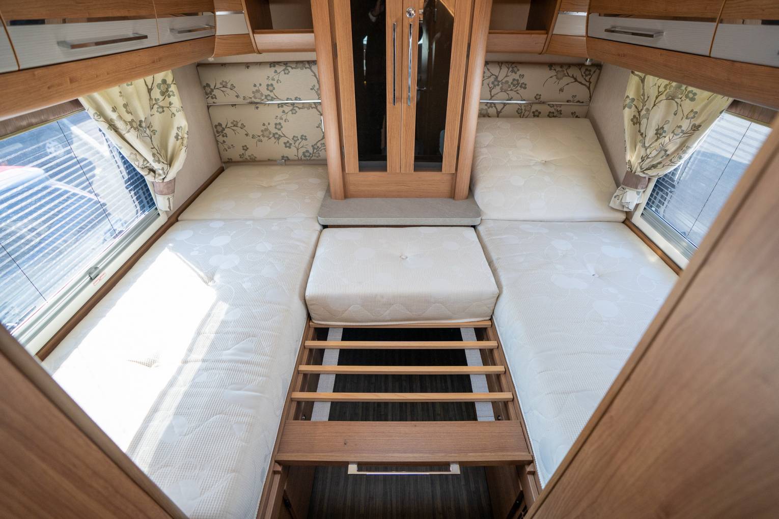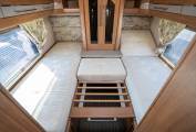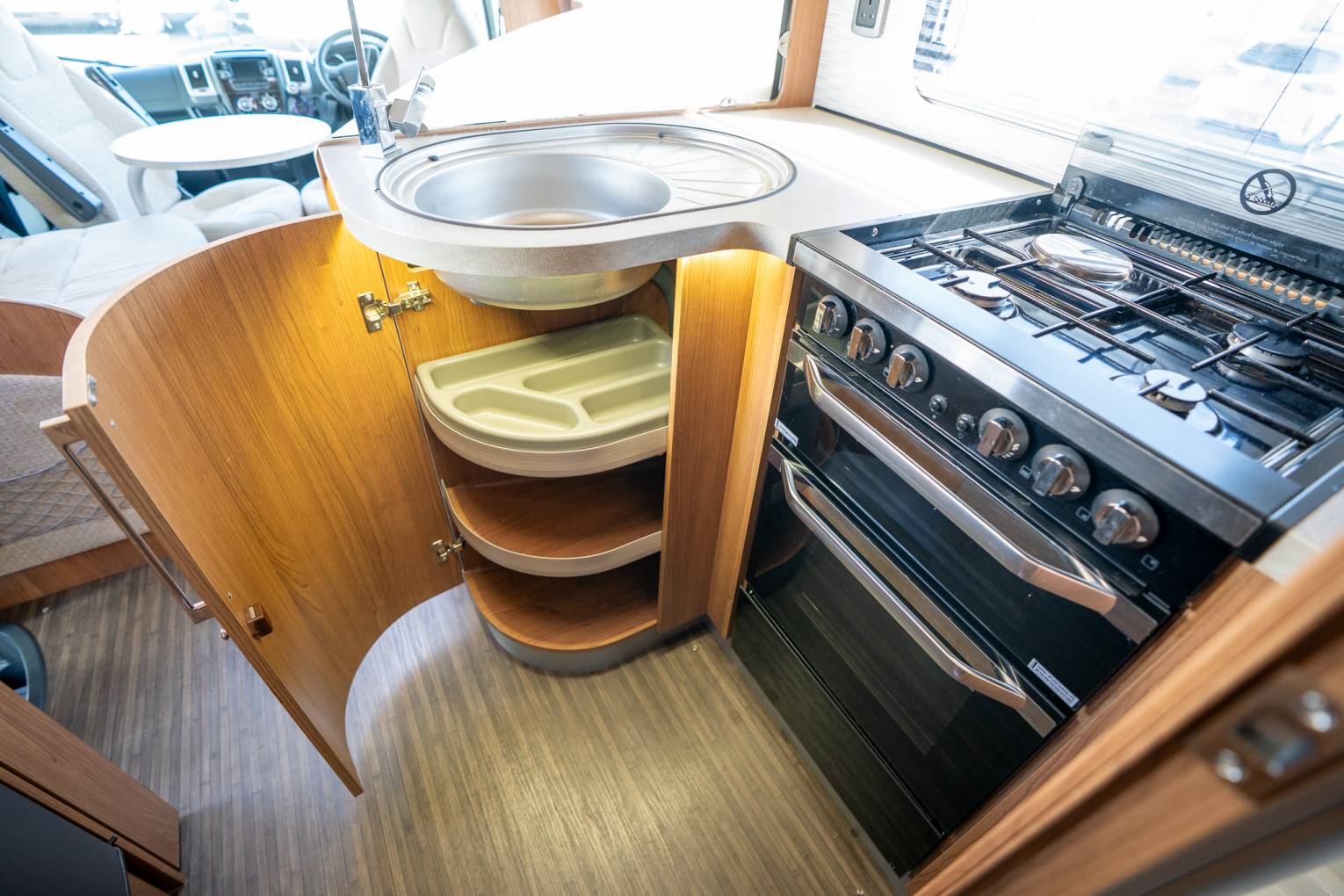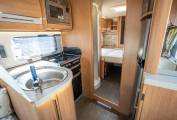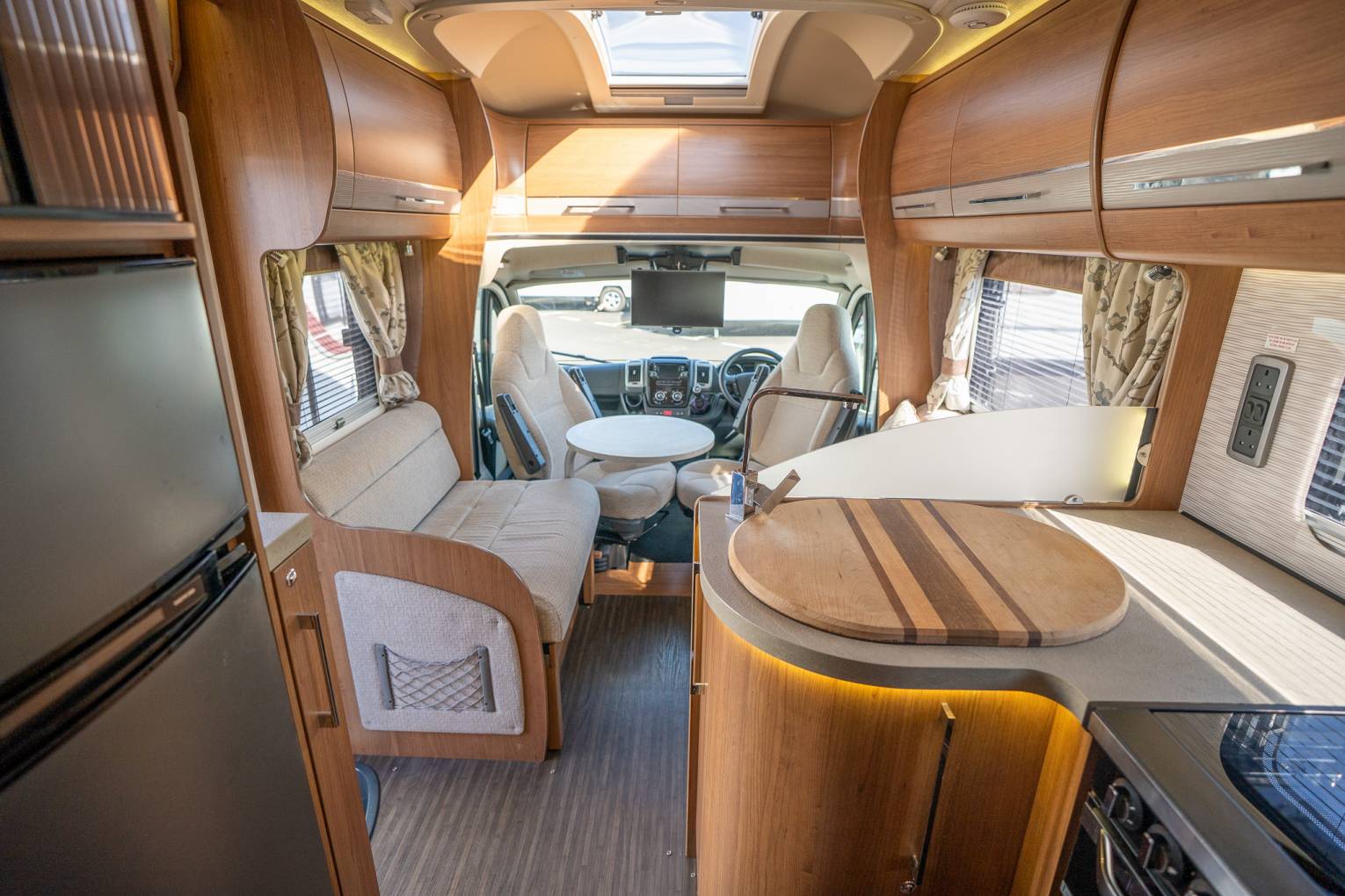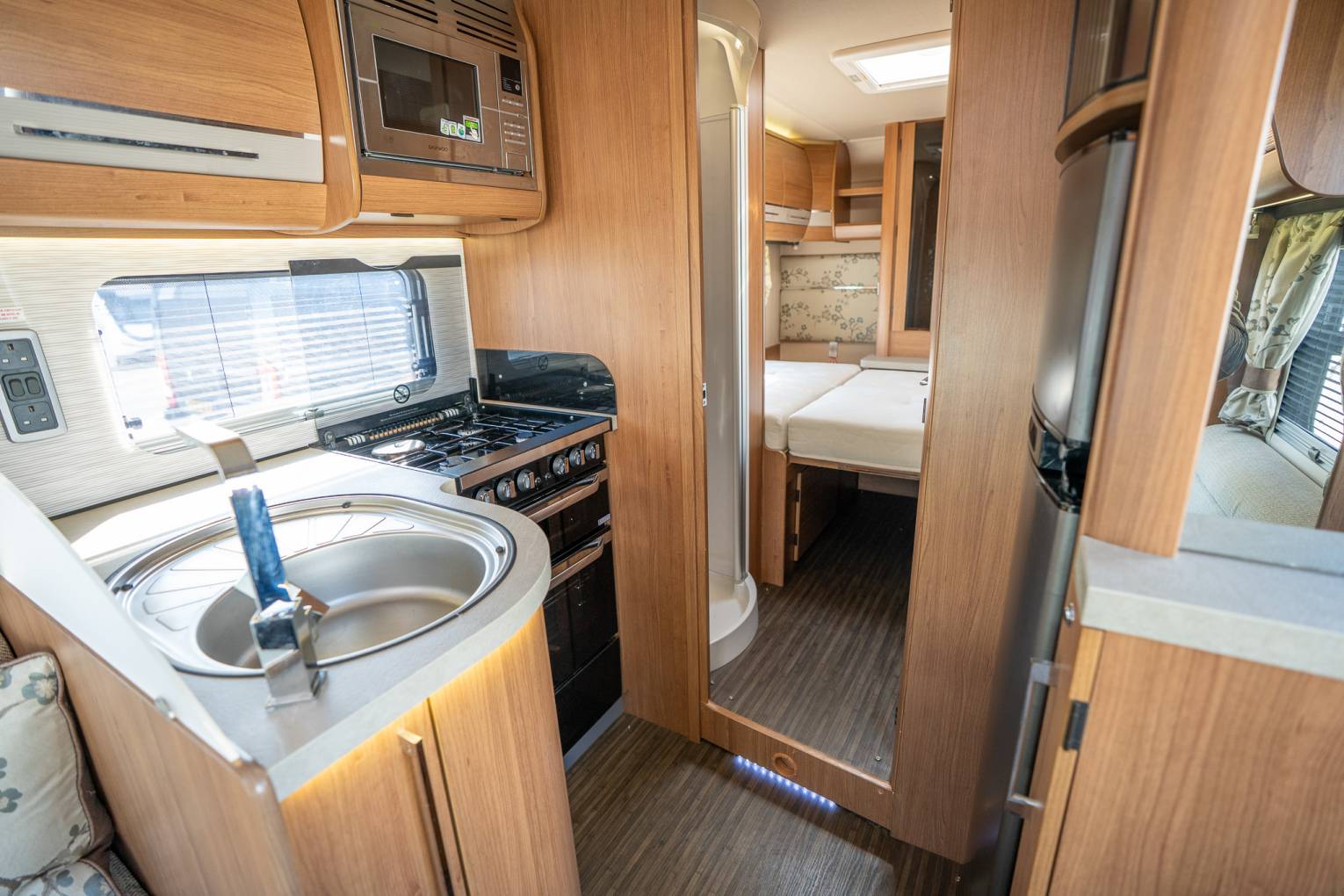 This vehicle is a much-loved and well-looked after staple from one of Britain's leading Motorhome Manufacturers. As soon as you enter the vehicle, you can tell it has been meticulously looked after and maintained to a high standard. Upon entering the habitation door, you are greeted with a spacious and fully equipped L shaped kitchen. The 175ltr Fridge Freezer sits opposite a functional kitchen worktop area with flush fitting 4 ring hobs, including 3 x gas and 1 x 800w electric. The kitchen comes with domestic style worktops, soft close drawers, a sink, oven and all that you'd expect from a motorhome ready to depart on long or luxurious adventures. The whole aesthetic is brough together neatly with stunning under worktop LED feature lighting. The main living area features fire retardant fern luxury upholstery with dress curtains, on-the-move heating, overhead lockers and a stylish drop down TV screen. The rear of the vehicle is where the luxury meets style as the bedroom opens up, with a full sized fully enclosed seamless shower cubicle and separate toilet/washroom either side of the hallway. At the end, you have plenty of large cabinets surrounding a bespoke bedroom, with two single beds complete with adjustable backrests, so you can relax in the evening with a book, TV or your favourite entertainment.