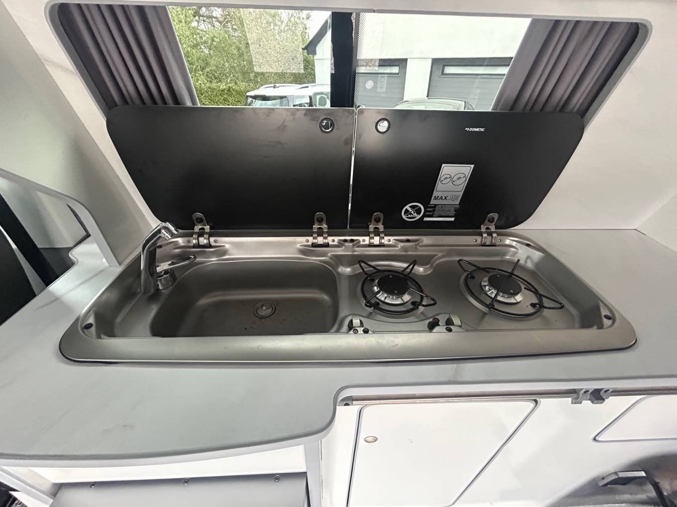 The kitchen is fully equipped with a 2-burner gas hob, sink and a Alpicool fridge/freezer with a good work space. Lots of storage spaces in cupboards and USB connections everywhere.