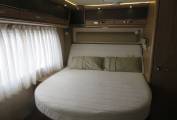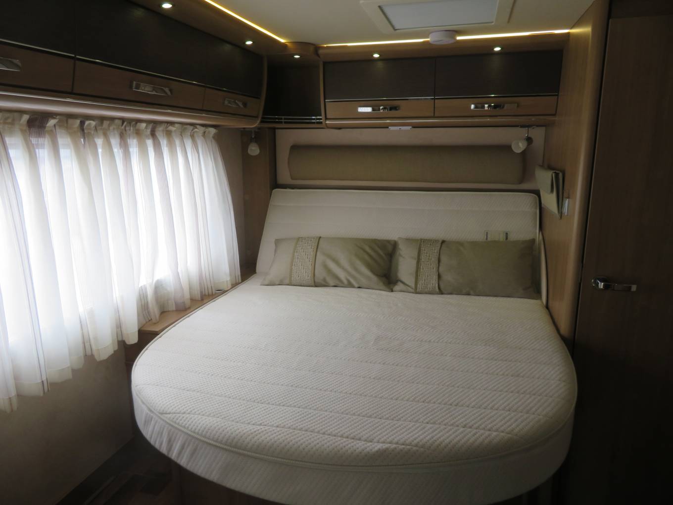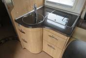 The spacious kitchen with solid surface stone type worktops, is equipped with a 3-burner stove with automatic ignition, various drawers with bearings with a surprising amount of storage space for cooking utensils and groceries, large double-door refrigerator 150 ltr with separate freezer and fully automatic switching of 220 V / 12 V / gas. Within the Dometic Tek-Tower we also have the rare factory fitted option of Gas Oven & Grill especially for the UK market.