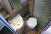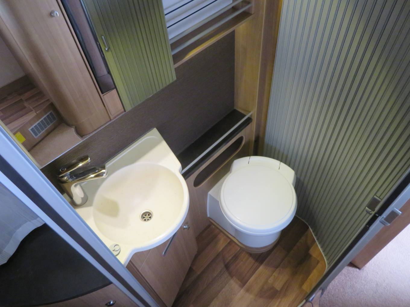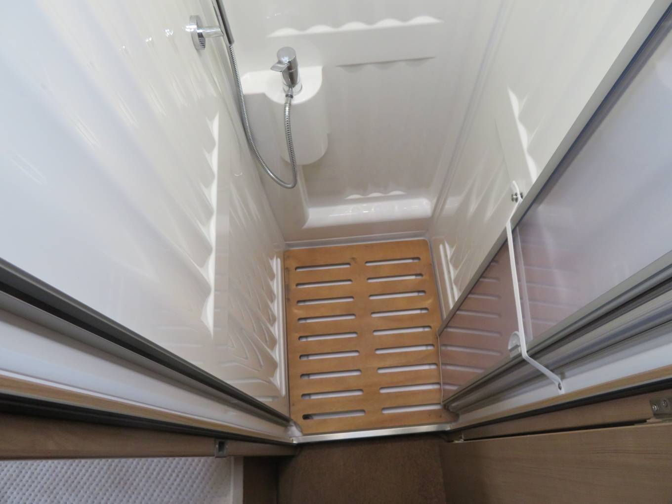 The luxurious bathroom with washbasin and Thetford toilet and extra cupboard You also have a spacious shower cubicle at the rear.