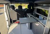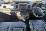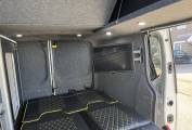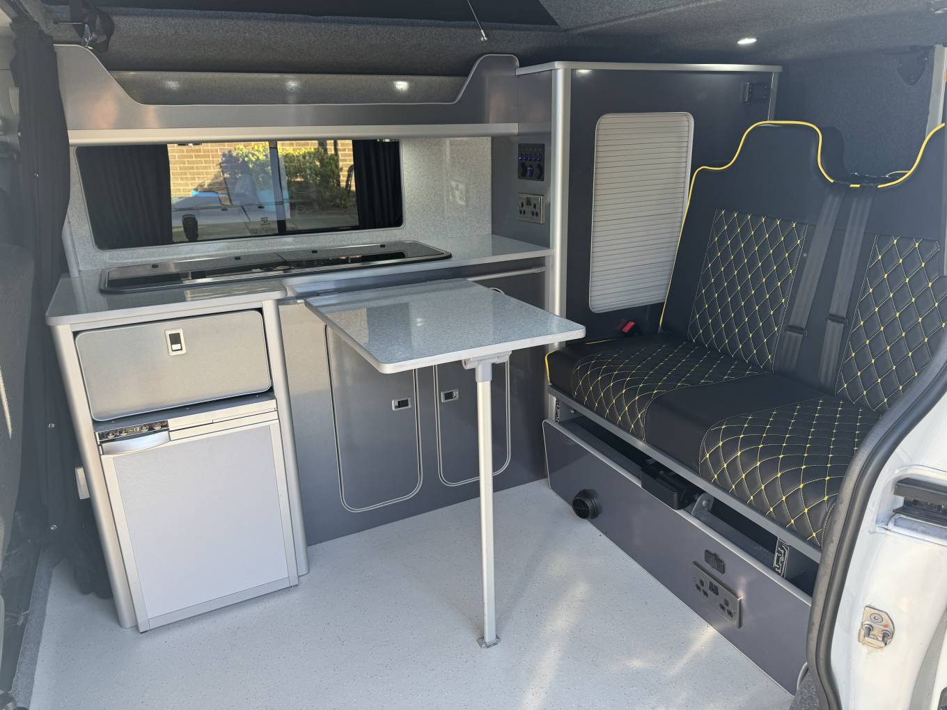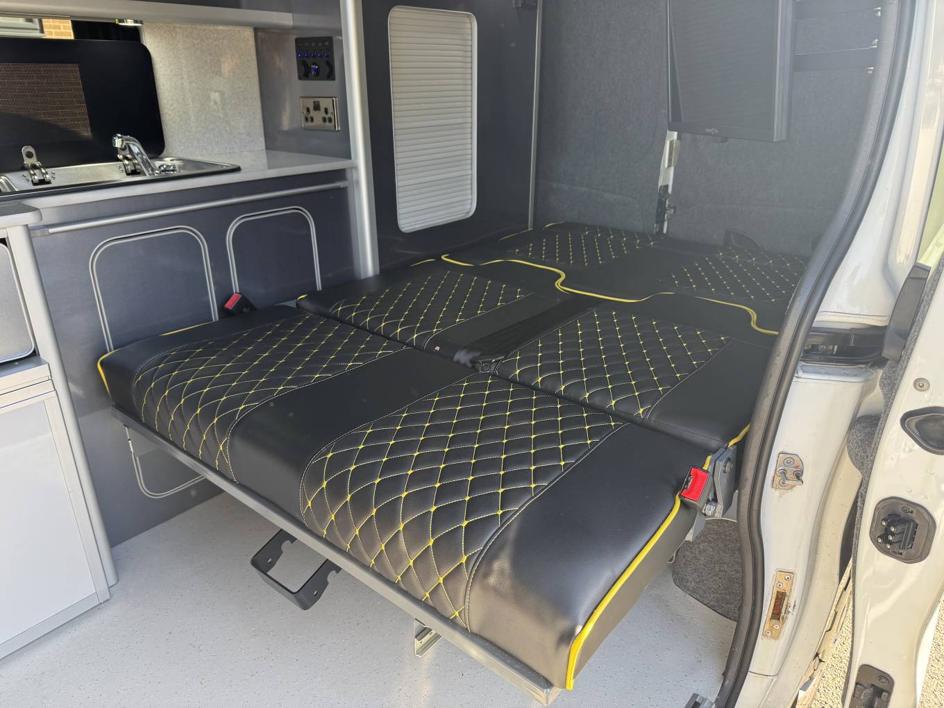 This high level quality conversion offers a 4 berth sleeping capacity along with 5 travelling seats. The cab which boasts 3 of the 2 travelling seats also has the 2 swivel chairs that can be turned around using the swivel plate to face the centre dinette and the remaining 2 travelling seats. These seats are also able to slide forwards and backwards to give you more space when turning. In the Cab there is a touch screen interface which includes radio, bluetooth phone along with electric windows and mirrors.