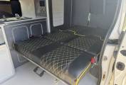 The rear 2 travelling seats pull forward to make the large double rock and roll bed with storage around each side and underneath. Above this in the roof is another large double bed which can hold up to 100-120kg in weight. The base of the roof bed also pushes up to allow for more head room when not in use.