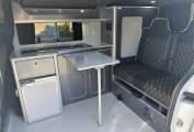 The centre dinette includes 2 ring gas hob, stainless steel sink and a good sized fridge with freezer compartment. In this area, there is a removable dining table which is positioned between the 5 travelling seats. .
